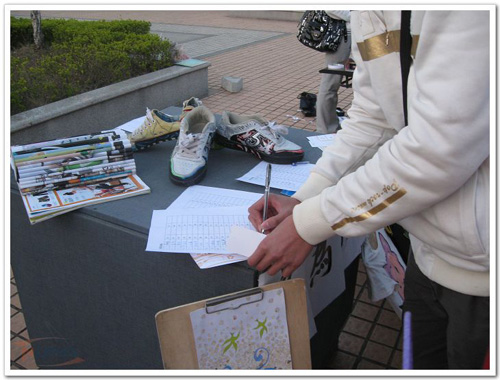 下午5点,随着音乐声起,现场投票活动正式开始。现场投票的每一位观众可以在任一自己喜欢的作品的单子上签上自己的名字,表示对该作品创作者的支持,也表示对环保事业的支持。投票者可获赠一张纪念书签。现场的作品有用废弃衣物改造的收纳袋、手绘CDDIY衣服等,还有现场教DIY衣服和鞋子。活动吸引了很多同学,不少同学还亲手尝试了一下DIY