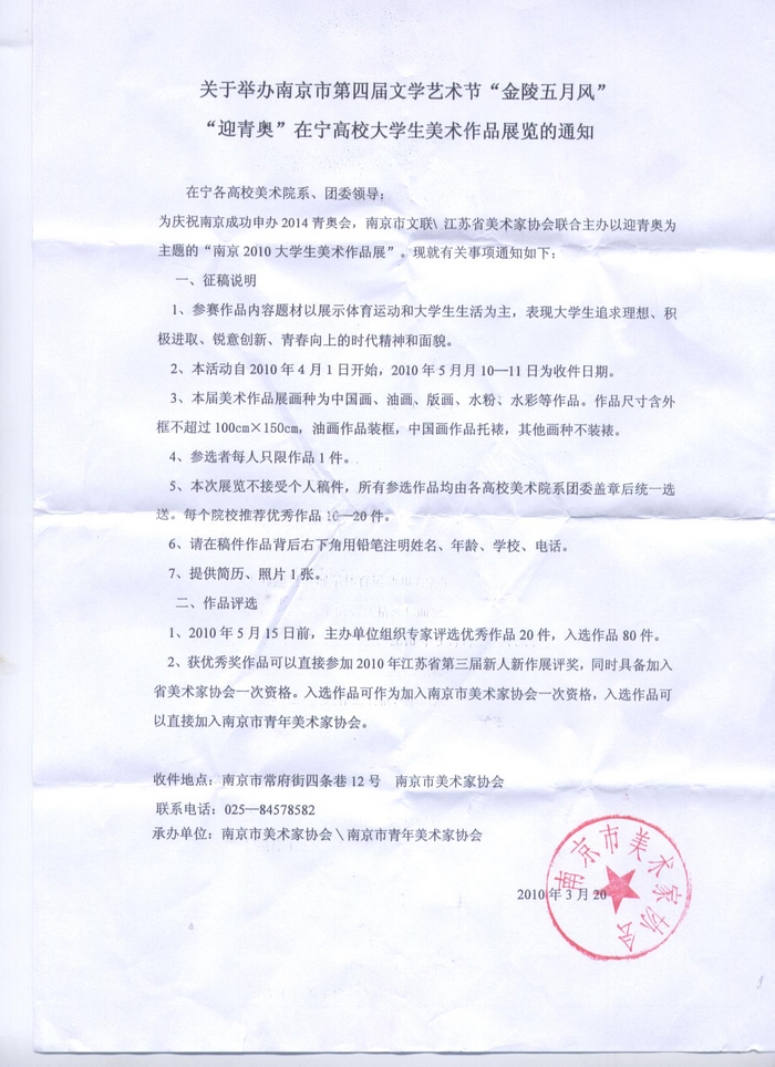 关于举办南京市第四届文学艺术节“金陵五月风”“迎青奥”在宁高校大学生美术作品展览的通知