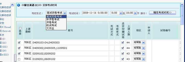 各学院、教学单位: 为促进本科生课程考核组织管理全过程科学化、信息化、规范化建设,结合我校多年考试组织管理的实践经验,教务处新开发了本科生考试管理系统。目前,对于非集中停课课程的考核(即课程结束后的考核),从本学期开始,老师可随时随地自主上网申请组织考核。明故宫、将军路校区的学生及老师均可上网查看课程考核安排。现将任课教师、教学单位、学生的操作流程、总体要求、操作要点说明如下。 一、 任课教师操作流程、总体要求、具体操作要点说明 1、操作流程式: 进入教务系统―→考试时间申请―→考试地点申请―→查看/打印考试安排―→打印送印单及试卷标签 2、总体要求: 1)为确保监考安排、网上发布、试卷送印等后续考务组织工作顺利进行,申请教师务必在课程结束两周前完成本项操作。 2)对于同一门课程具有多位任课教师,需共用一套试卷且同时组织考核,由一位任课教师同时完成考试时间及地点申请操作。 3)完成考试时间和地点申请操作后,任课教师均可查看/打印考试安排信息。 4)考试前一周,申请教师方可打印试卷送印单、试卷标签及考生签到表(带照片)。试卷送印地点遵照以往要求执行,若有变动另行通知。 3、具体操作要点说明 图一 1)“考核形式”为下拉式菜单,申请人可根据课程考核要求,选定相应的考核形式; 2)“是否共用一份试卷”中,“是”或“否”的选择说明: 申请人进入系统时,默认情况为“否”。 “否”选择项说明:凡同一门课程(课程号相同)的一位或多位任课教师,需在同一时间组织考试,且共用一套考卷,即可委托其中一位任课教师完成考试时间及地点申请。 “是”选择项说明:只有在如下示例情况下,才选择“是”选项:例如“张三”老师已成功申请考试时间及地点,“李四”老师事后得知,并想同时且共用“张三”老师的考卷,请选择“是”。此项操作必须使用“张三”老师的教务帐号完成“李四”老师所有班级的考试申请,从而确保系统提供同一个试卷编号,老师提交一套考卷。 3)选择考核形式为“大作业”的课程,完成图一操作即可。 4)申请人可根据图二窗口,再次确认“考核形式”、“考试时间”,若有误还可修改。 5) 在图二窗口的“选择”列中,选择参加考试班级。最后点击“确定考试时间”按扭,完成课程考试时间的申请。 图三 4)需用特殊地点组织考试的(如机房、舞蹈房、各学院专用教室等),申请人务必先落实考试地点的情况下,自己手工输入考试地点。 5)所有笔试考试课程,请点击“查找并分配教室”,系统自动匹配合适的考场。若对系统自动匹配考场不太满意,申请人可自行选择系统提供的教室。 6)教室后面括号内的数字[如2101(85)]为该教室最大容纳考生人数,若考生人数超过教室最大容纳人数,则考试地点申请不能成功。 7) 对于上课人数太多或重修生需单独安排考试地点的,请点击“重修学生分散安排”,后,再点击“查找并分配原则教室”。 二、各教学单位操作流程、总体要求 1、操作流程 1)进入教务系统―→监考安排―→查看/打印考试安排 2)进入教务系统―→监考安排―→撤销考试申请 2、总体要求 1)委派监考前,核查考试地点是否合理。不合理的情况下,对课程和学生均为本院,教学单位负责人可进行“撤销考试申请”,退回到“考试时间申请”或“考试地点申请”状态。若涉及其它学院,请与考试中心联系。 2)为确保考试信息网上发布、试卷送印等后续考务组织工作顺利进行,各教学单位务必在考前一周完成监考委派并落实到位。 3)监考委派原则:开课教学单位委派主监考;相关学生所在院按要求完成副监考委派。 4)在“查看/打印考试安排”中的所有课程均为已上网发布课程,若有变动,请提交书面材料到考试中心。 三、学生操作 1、操作流程 进入教务系统―→查看/打印考试安排 2、要求说明 所有考生务必上网查看考试课程、考试时间及考试地点,按要求准时参加考试,不能随意进入其它考场参加考试。 四、考试管理系统开发说明 本着以规范化、信息化、科学化地组织本科生课程考核的原则,以为全校广大师生及管理人员提供方便、准确的考务组织与管理信息为宗旨,从本学期开始,逐步实现和应用此本科生考试管理系统,热诚欢迎广大师生及管理人员提出宝贵意见及建议,以便我们进行改进和完善,更好地为您提供最优质地服务。 联系单位及电话:教务处考试中心 84891212。 教务处