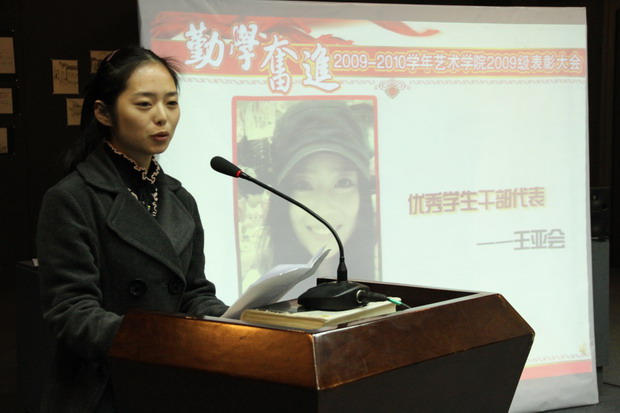 12月7日下午四点,在艺术中心一楼展厅举办了“勤学 奋进”私人影院 2009级本科生年度总结表彰大会。院党委副书记徐曙峰老师,音乐系副主任路漫漫老师,院团委书记雷蕾老师,音乐系邱爱金老师以及各年级辅导员出席了本次大会。