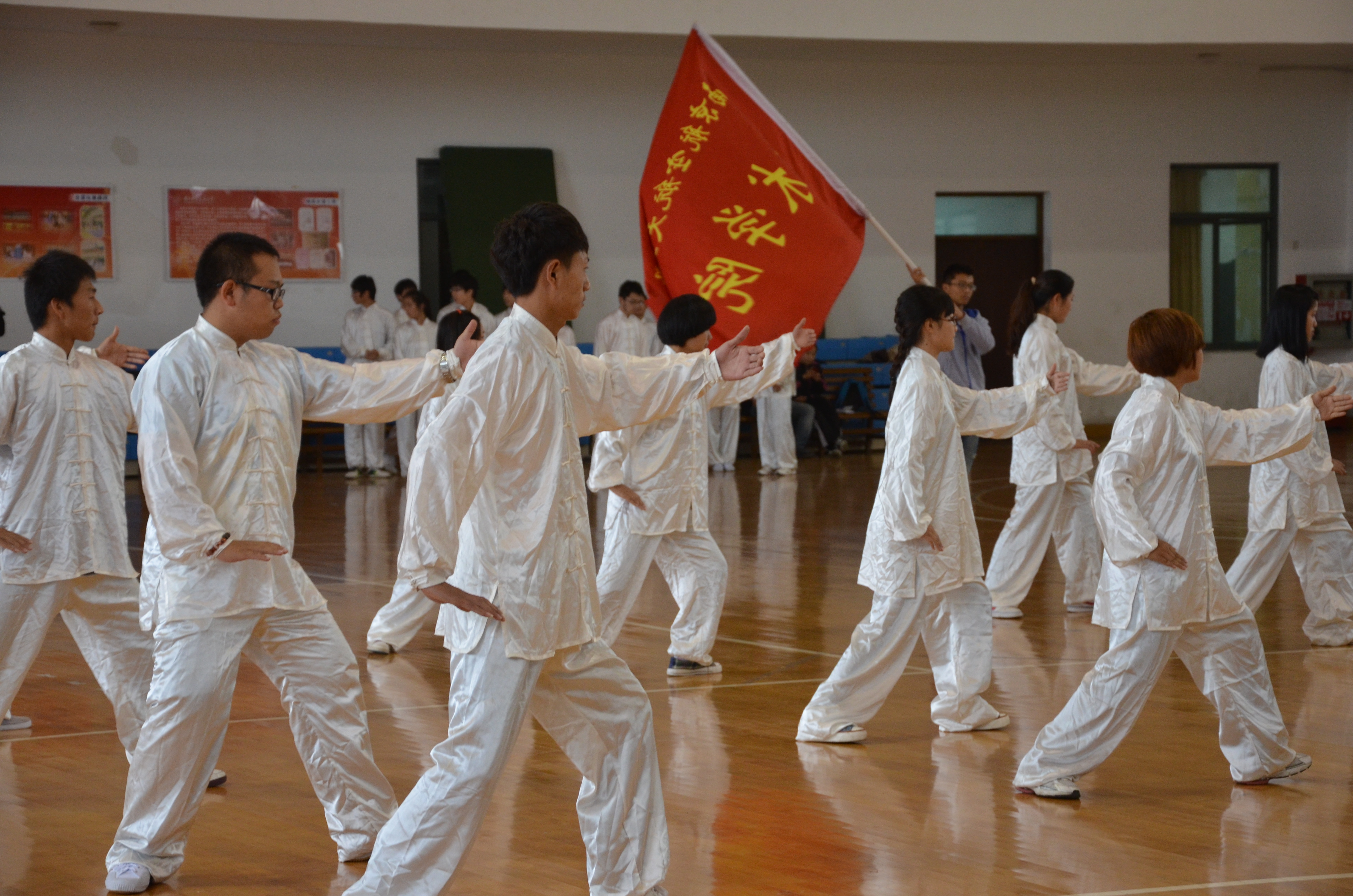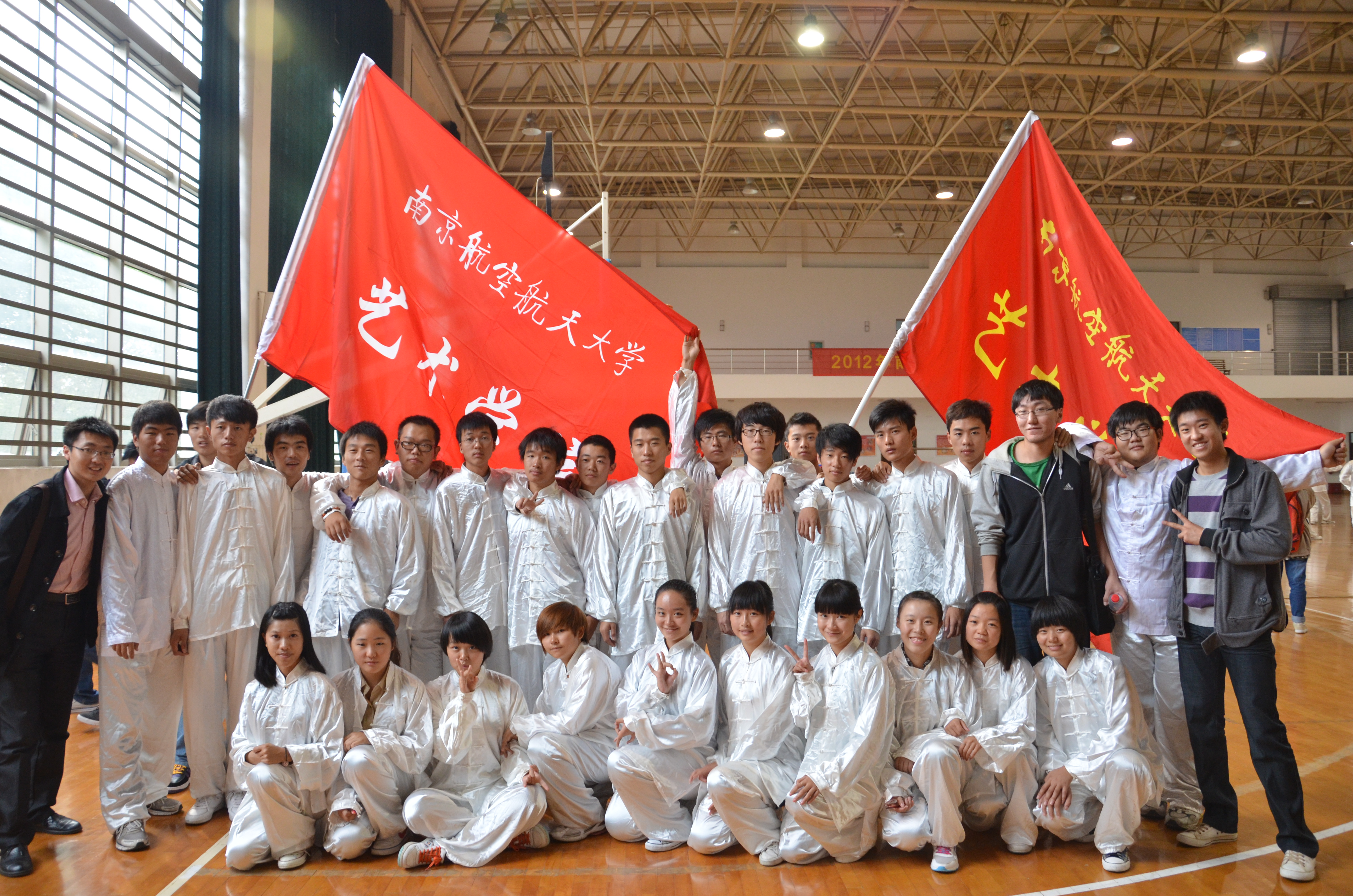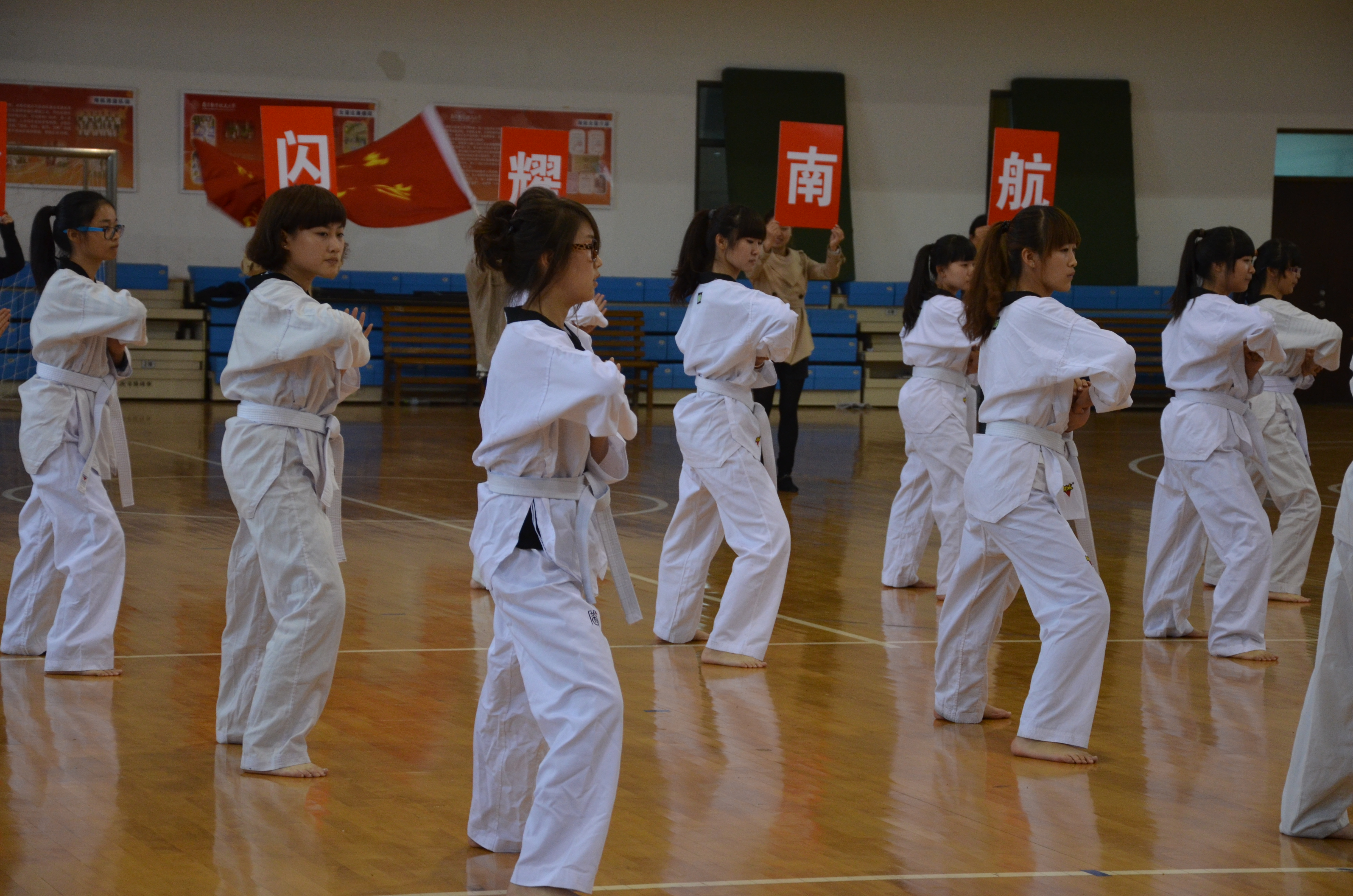 的参赛方阵踏着整齐的步伐进入比赛场地,场边的啦啦队们也积极的为运动员们呐喊助威,“艺新璀璨,响彻南航”的加油声响彻全场,尤其是我们的跆拳道方阵,相较于理工科学院由大部分男生组成的方阵,我们是清一色的女生,但不仅气势上没有输,而且在整体协调性和动作上明显占优,队员们精彩的表演赢得了现场观众的阵阵掌声。