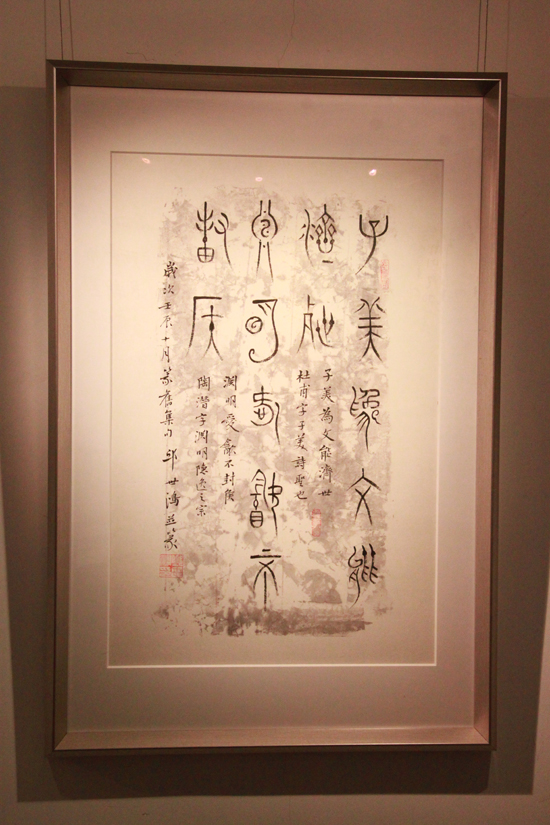 本次展览共展出了九位青年书法家的作品,私人影院 美术系院邱世鸿老师提供篆、隶、行、草体作品五件参与展出。邱世鸿老师书风俊逸遒拔,清雅自然,与其豪放、奔放、雅逸的性格一致,受到了同行和社会各界的一致好评。