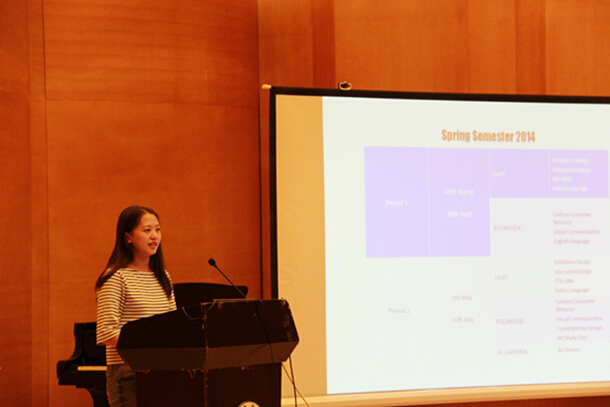 张捷院长在汇报会上发表了热情洋溢的讲话。她用了三个关键词表达了观摩感受。一是祝贺,她认为访学活动有助于专业能力的提升,国际艺术视野的开拓,和行业专家人脉的建立。此次赴意之行中欧洲艺术气息和氛围的感染和渗透,将成为师生一生宝贵的财富;二是感谢,感谢学校尤其是国际合作交流处和教务处,对学院访学活动的支持;三是希望,她介绍了学院所搭建的国际合作交流平台,希望同学们能够积极地对自己的学业、专业和职业道路进行思考和规划,充分把握每一次适合自己的机会。