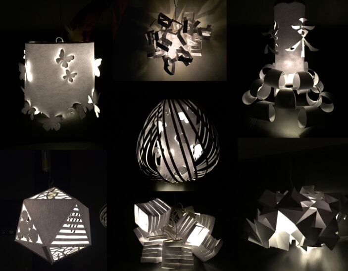 利用小正方体拼凑成的不规则吊灯、富有童趣的“水母灯”、结合中国传统的“汉字灯”、翩翩飞舞的“蝴蝶灯”……环境设计专业的同学们在短短几个小时的时间内完成的作品得到了Stefano教授的称赞,作品在私人影院