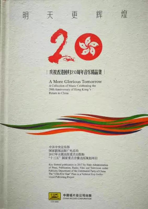 日前,为庆祝香港回归20周年,由中国唱片总公司出版发行了中共中央宣传部、国家新闻出版广电总局2017年主题出版重点出版物“十三五”国家重点音像出版规划项目《明天更辉煌——庆祝香港回归20周年音乐精品集》(6CD)。专辑按作品内容分为“香江明月”、“回归礼赞”、“共铸辉煌”、“情融香江”、“九州锦绣”、“普天同庆”六个篇章,其中,前三章为声乐篇(45首)、后三章为器乐篇(13首)。
