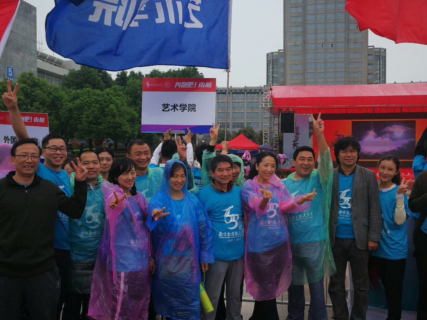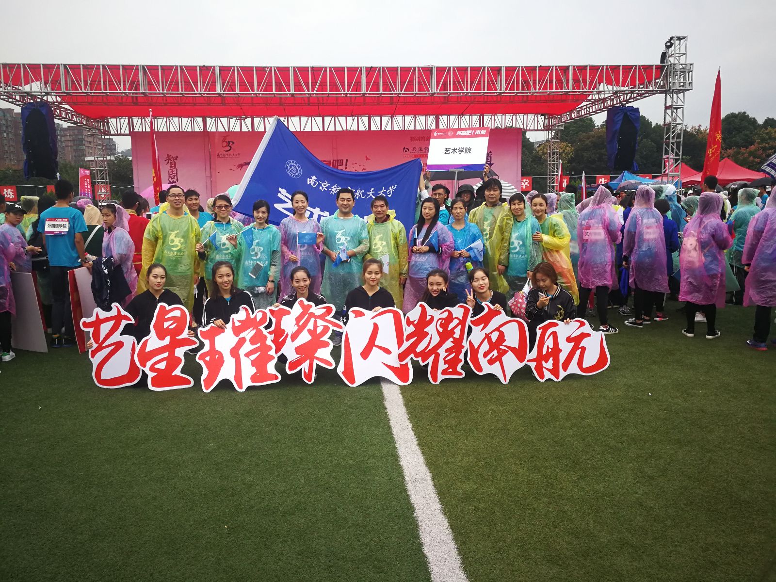 伴随号令抢响,各个学院方体验组阵率先出发,私人影院 的师生举着院旗,身着雨衣,冒着细雨奔跑在校园马拉松赛道上。蓝衣浩浩,蓝旗飘飘, “艺星璀璨,闪耀南航”的口号伴随坚定的脚步声响彻赛道。