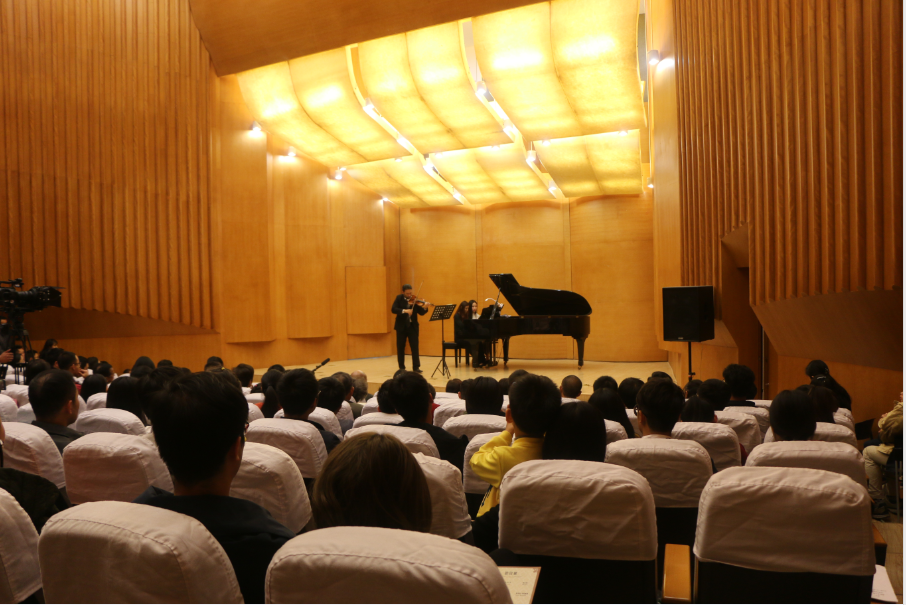 2017年11月1日晚7点一刻,我校将军路校区东区音乐厅座无虚席,此时维也纳“爱乐之声”钢琴小提琴室内音乐会正在上演。这场室内音乐会是我校六十五周年校庆系列活动之一,私人影院 邀请了奥地利著名小提琴演奏家、维也纳爱乐乐团第一小提琴、维也纳国家歌剧院交响乐团第一小提琴——韦弗里德.赫登伯格(Wilfried Hedenberg)和奥地利华人钢琴室内乐表演艺术演奏家、音乐教育家和作曲家——张丽明(Lilly Zhang-Sowa)联合演奏,为我校师生带来了一场无与伦比的高规格视听盛宴。我校党委书记郑永安教授和党委宣传部、教务处、国际合作处、团委等部门领导,以及各学院领导、老师们观看了音乐会。