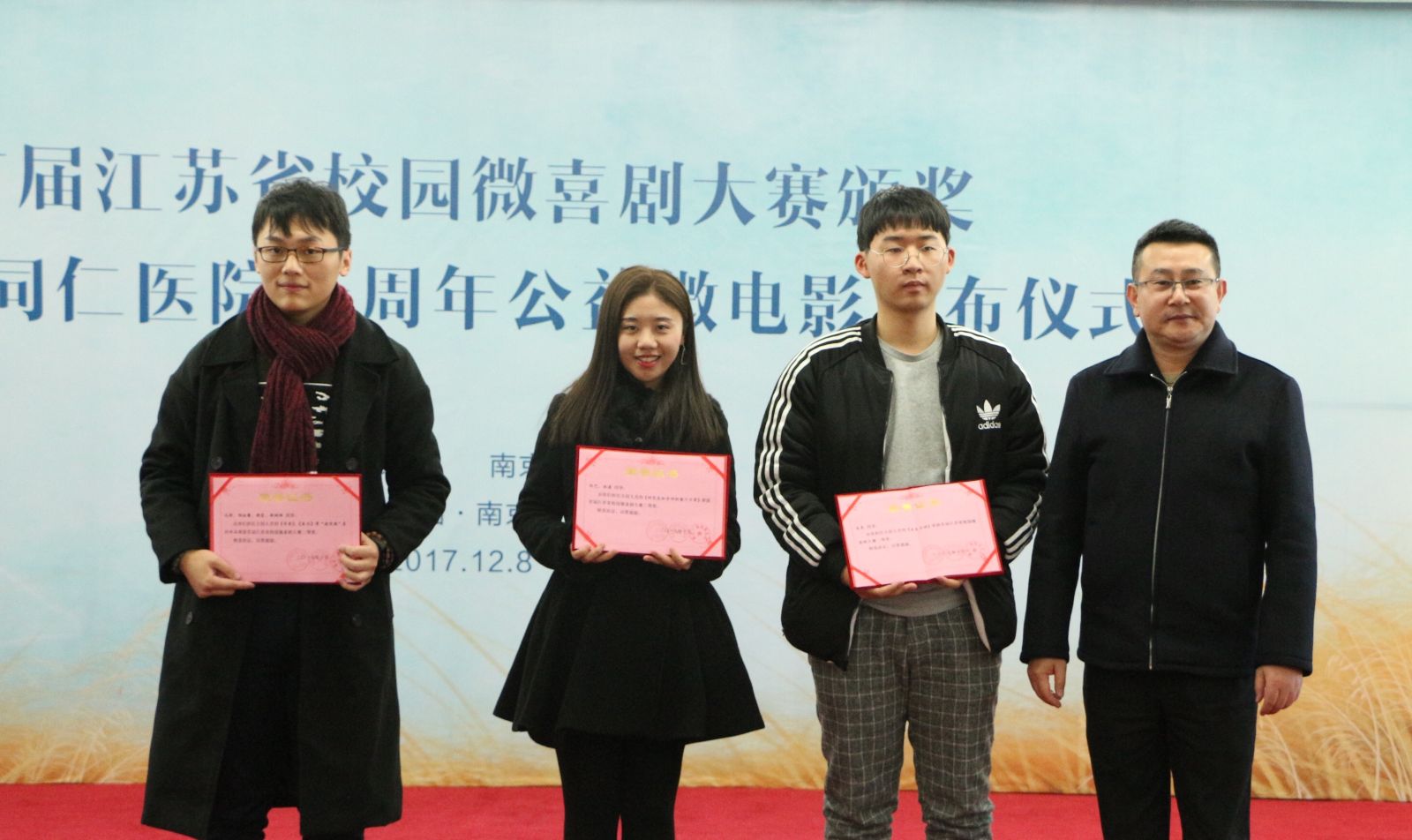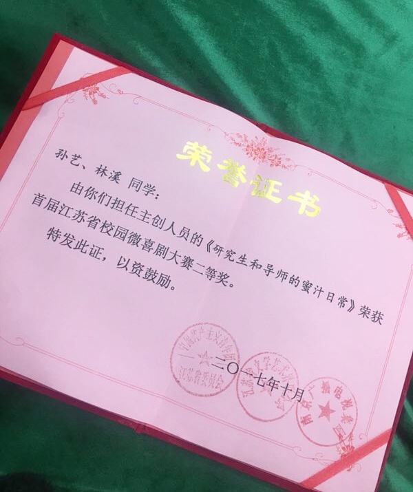 12月8日,由共青团江苏省委、江苏省文学艺术界联合会主办,南京广电集团承办的首届"江苏省校园微喜剧大赛"举行了颁奖仪式。我校私人影院 16级研究生孙艺和林溪的作品《研究生和导师的蜜汁日常》经过层层选拔,在大赛中脱颖而出,获得了二等奖。同时,我校私人影院 屈雅红教授获最佳指导教师奖。