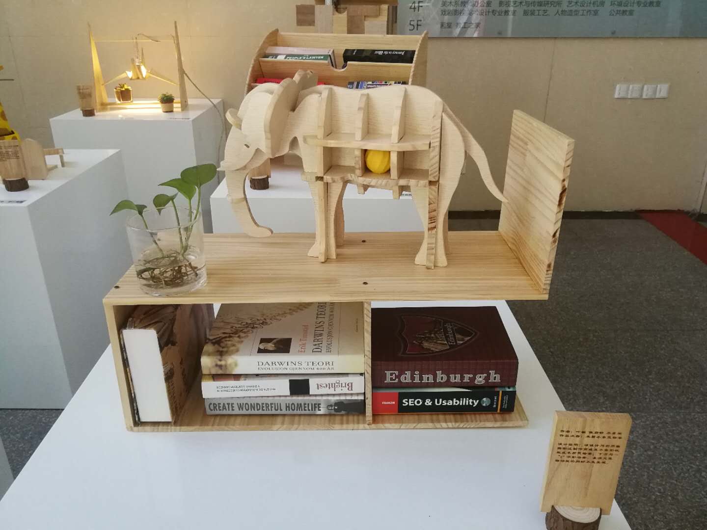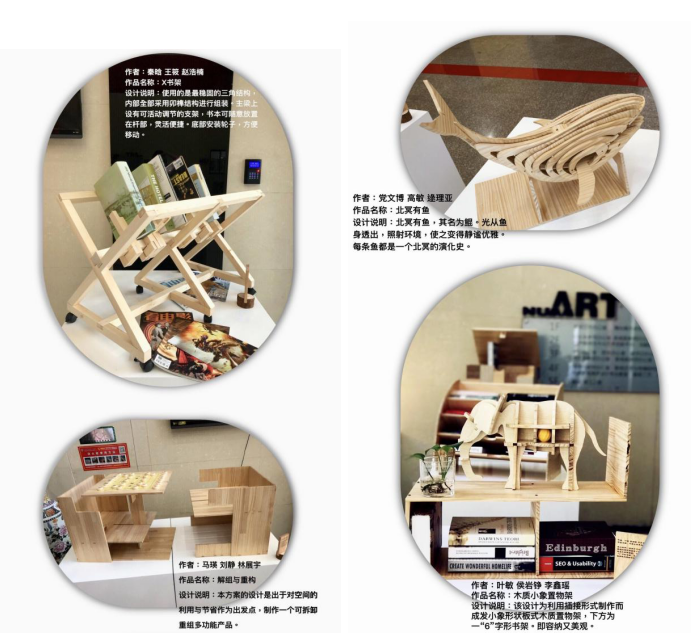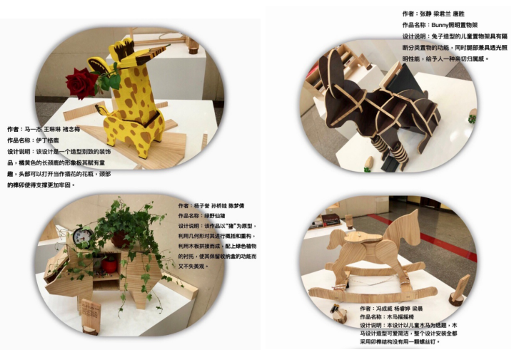 此次展出的作品,是在老师的精心指导下完成。老师根据实际情况,制定了针对性的教学计划:费斯托(FESTOOL)木工加工系统应用培训+创意或实用功能的板式家居设计呈现。课程的设计思路:利用自然界中动植物体态特征作为创意来源,然后进行几何造型重塑,改变具象形态尺度关系,概括结构层次,并使得造型更为夸张。设计过程中,学生需要确定陈设品的功能定位,并在此基础上进行功能分析与设计、结构设计、造型设计、工艺流程设计与制作流程优化设计的几个环节。