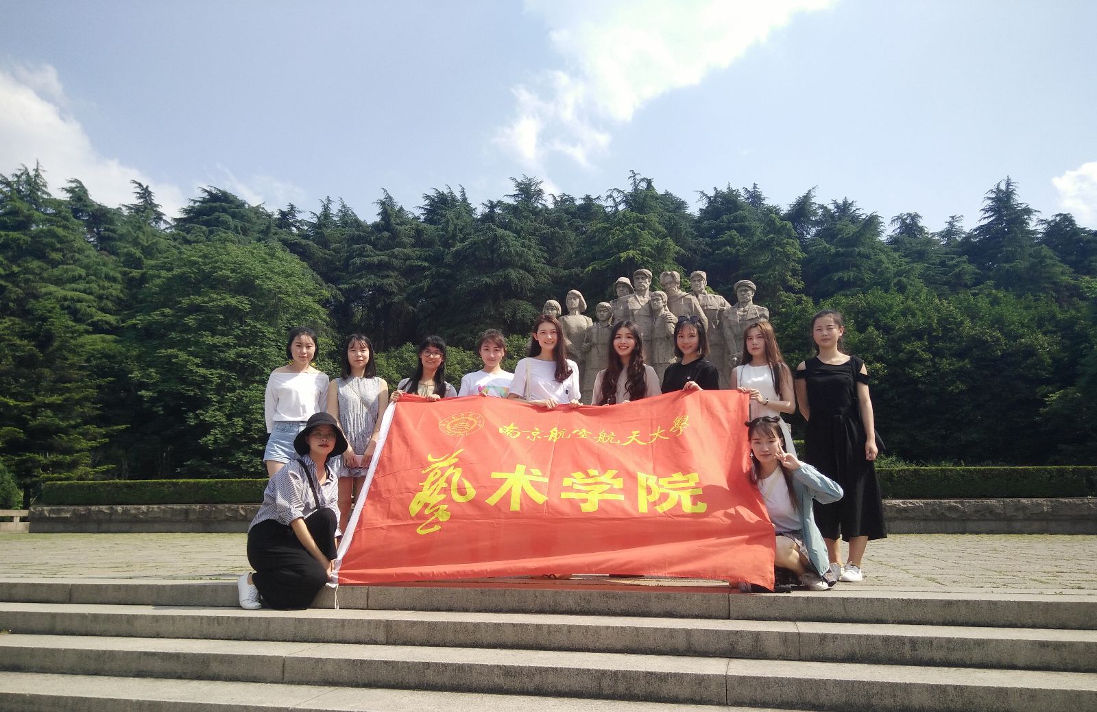 同学们从北门进入烈士陵园,一进门便被巨型烈士雕塑群像所震撼。这组群像由179块花岗石拼装塑造而成,共雕刻了9位烈士的光辉形象。作为我国目前最大的花岗岩雕像,群雕以庄严的姿态伫立于骄阳之下,柏树环绕周围,以寓革命烈士永垂不朽。沿群雕环陵大道而上,入党积极分子到达矗立于雨花台顶端的烈士纪念碑,高耸的烈士纪念碑营造出庄重的环境氛围,不禁使各位入党积极分子对烈士们保卫祖国不惜付出生命代价的胸襟与气概产生敬佩之情,也让各位入党积极分子深深感慨当下和平生活的来之不易。