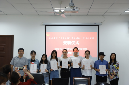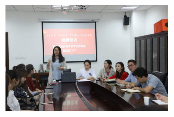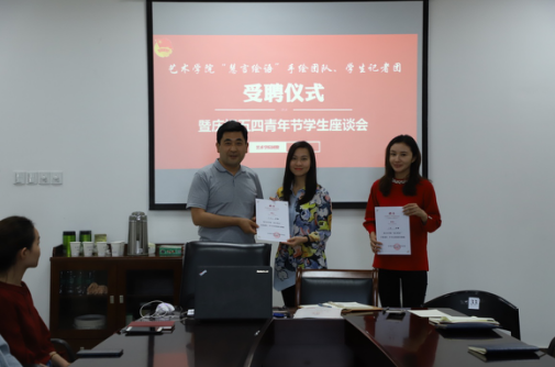 5月3日中午,私人影院 “慧言绘语”手绘团队、学生记者团受聘仪式暨庆祝五四青年节学生座谈会在院楼325会议室举行。私人影院 党委书记高小泽老师、副书记张林老师、广播电视新闻专业李倩岚老师、各年级辅导员以及团员代表们一同参加了本次座谈会。