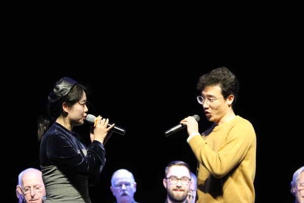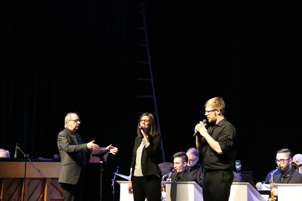 音乐家们在两个小时里,为学校师生演奏了20首风格不同爵士乐作品,其中包括美国布鲁斯音乐、乡村音乐,以及欧美影视歌曲、流行歌曲、管弦乐主题曲等。在一曲《闲聊波尔卡》的演奏中,小号手走进观众席,带领观众全场互动。我校师生热情回应,跟随小号手在音乐律动中载歌载舞,将音乐会推向高潮。劳伦斯·达赫尔团长幽默风趣的主持和讲解拉近了观众与音乐家的距离。整场音乐会掌声雷动,洋溢着激情与温馨。当演奏到第17个作品到时候,指挥劳伦斯请我校私人影院 研究生李睿和张司臣同学登台,与音乐家共同则作了流行歌曲《月亮代表我的心》,引动全场共鸣,几位音乐家对我校两位学生的演唱赞不绝口,同时也印证了我校艺术人才培养艺术水准和国际视野。演出结束后,学生们久久不愿离场,他们与音乐家们交谈合影。