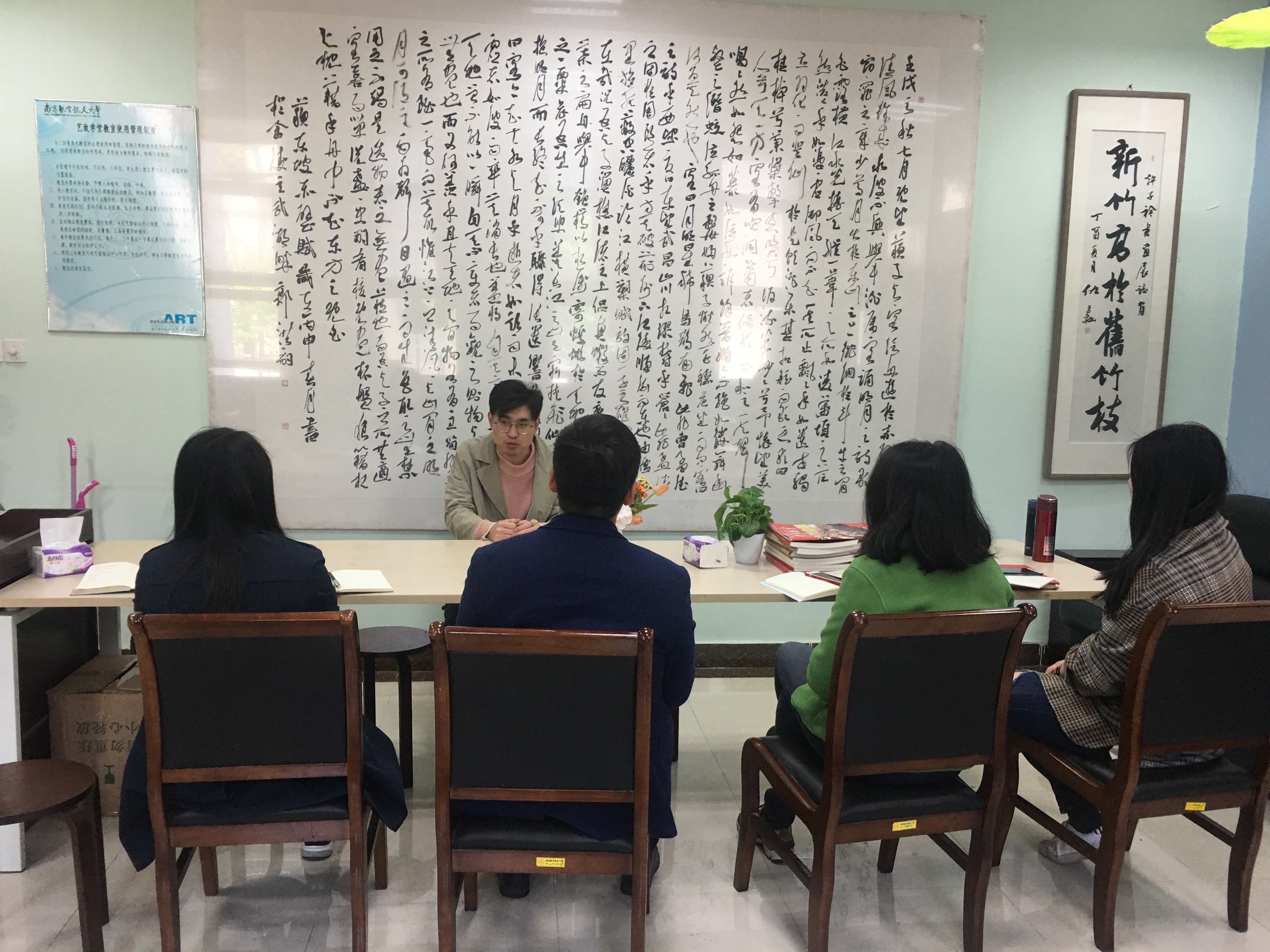 为加强私人影院 学工团队的理论学习力度,推动理论指导实践,深入了解学院专业特色,根据艺术专业学科特点开展富有成效的思想政治教育工作,学习党的理论知识,私人影院 学工团队制定了定期学习制度,2019年4月1日,在私人影院 砚湖书院的工作室里开展了“艺起学习”之中国书法史简论,由私人影院 美术学专业研究生杨林顺主讲,参与人员有私人影院 党委副书记张林,学院辅导员刘思辰、陶然雁、李爽、彭丽。