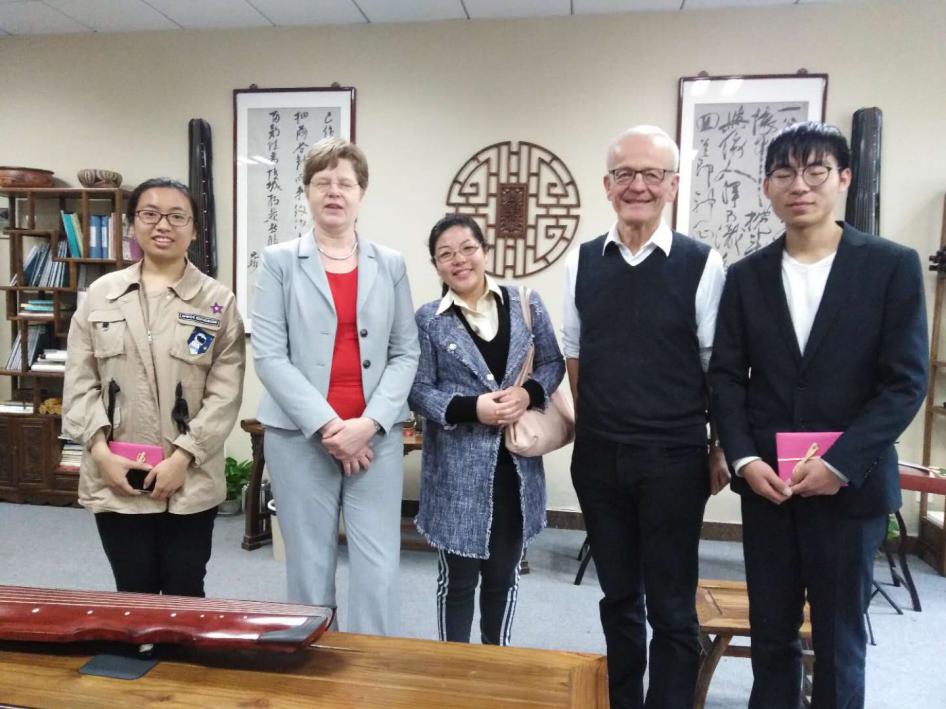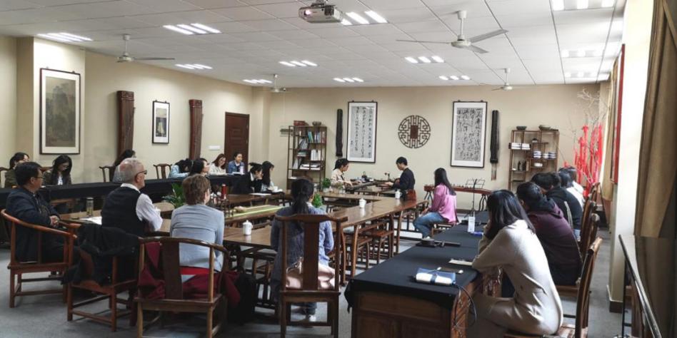4月12日上午,应私人影院 老师方璇博士邀请,汉诺威音乐戏剧和媒体大学校长Rode-Breymann教授和德国图宾根大学Erich Paulun院长Schmidt-Glintzer教授来到学私人影院 ,与私人影院 师生在砚湖书院开展了一堂别开生面的教学互动交流课。教学互动交流课上,来自航天学院的邹助萱和航空学院的王宁悦两位中国学生向在场的嘉宾演绎了中国传统乐器-古琴二重奏。两位学生通过本学期选修私人影院 方璇老师的《室内乐演奏实践》课程,在老师的指导下,将古琴传统乐曲《酒狂》进行了重新改编,融合了西方现代音乐特色及技巧,两位同学的二重奏展现出优雅的东方音乐魅力,受到了外宾的连连称赞和一致好评。外宾当场赠予礼物,并邀请两位学生去德国演奏,进行文化交流。两位外宾还与私人影院 音乐学、美术学、设计学等专业的老师和学生展开了互动交流及学术研讨,气氛热烈友好。板俊荣副院长、邱爱金老师参加了本次活动。