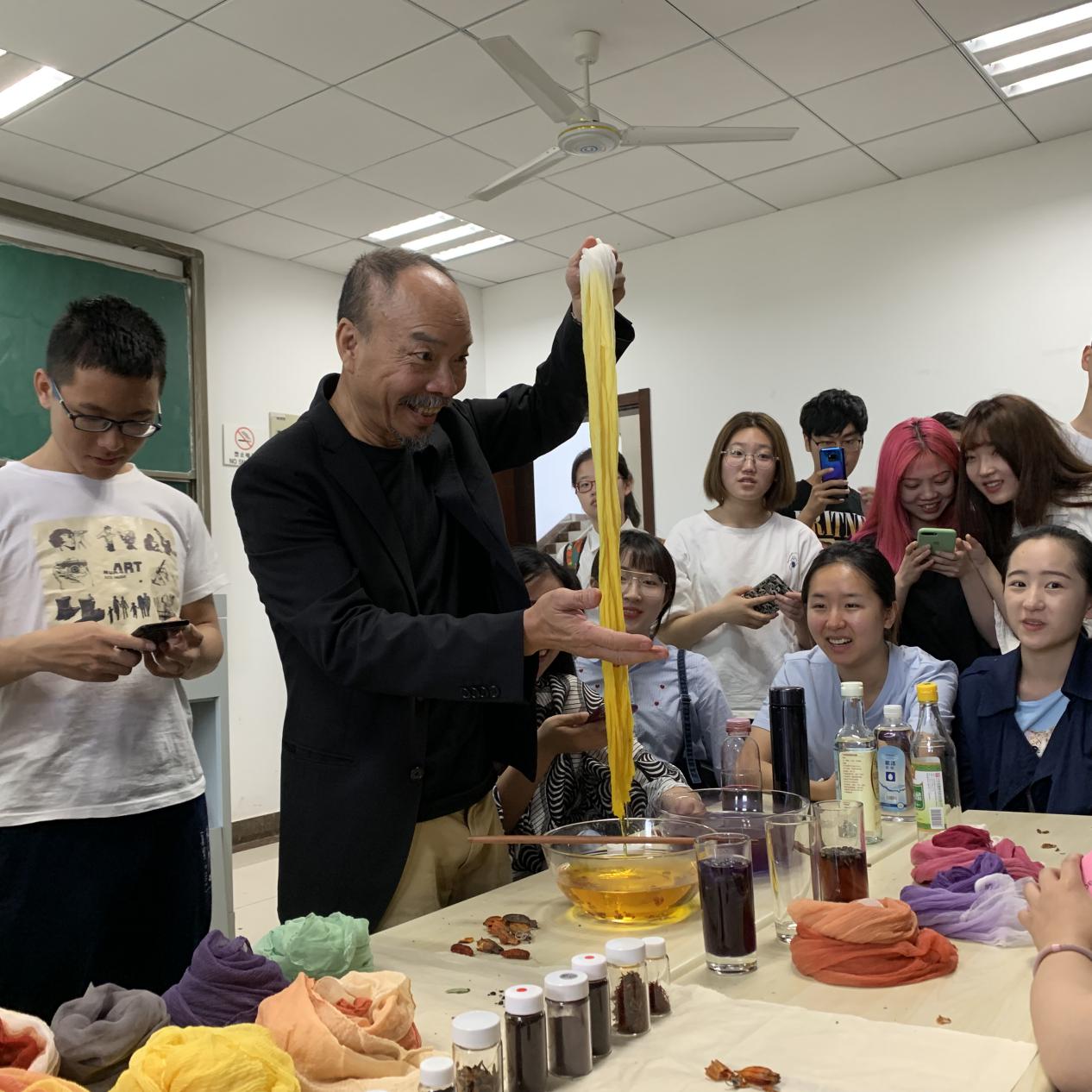 讲座最精彩的部分在于曾教授给学生现场演示了植物染色的过程。他现场演示了绯红、紫色、胭脂红和黄色的丝巾染色,让大家亲眼见证了色彩魔法般的变幻。曾教授致力于色彩方面的研究多年,他结合自己多年的研究经历和成果,讲述了这些颜色发现的过程以及它的作用和功效。在染色的同时,也讲述了这几种颜色染色的植物原料及名称的演变。