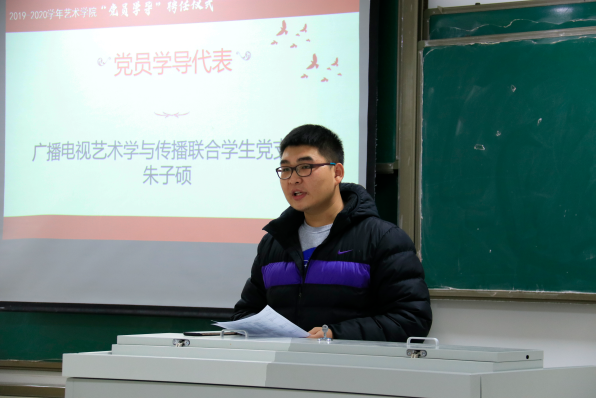 随后,学导代表朱子硕表示,“党员学导”肩负着这样的责任,来帮助学弟学妹们之后的学习生活,同时自身作为桥梁,更要拉近党组织和同学们的距离,传递党对同学们的关心。在接下来的生活学习中会努力思考,与师弟师妹共同进步。
