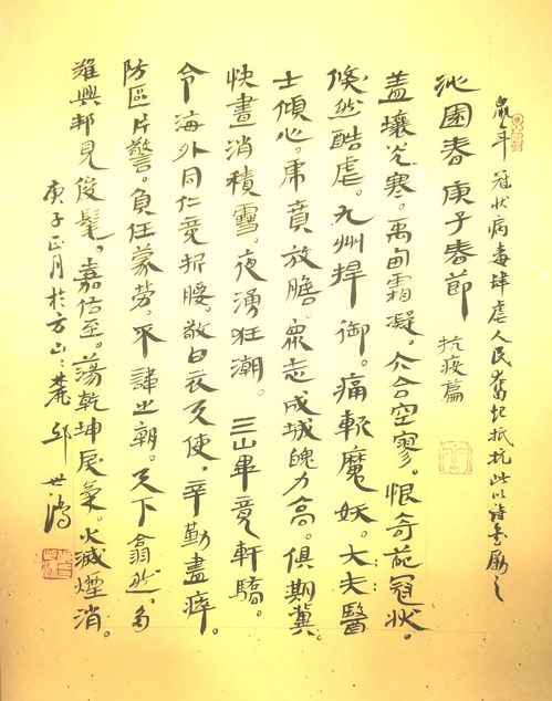 庚子鼠年,冠状病毒源起武汉,由荆楚蔓延全国甚至海外,寰宇惊恐。节日封城封区,市廛皆空,各居宅中。又闻各国火灾,流感,鼠疫,火山,海啸等不断,酷灾连绵,可谓浩刧。然国人意志坚定,戮力同心,捍御有力,局面稳定。文艺工作者以诗书画印为武器,表达情愫,支援江城。多难兴邦,一方有难,八方支援,事无巨细犹见赤誠。感念之,特此创作。