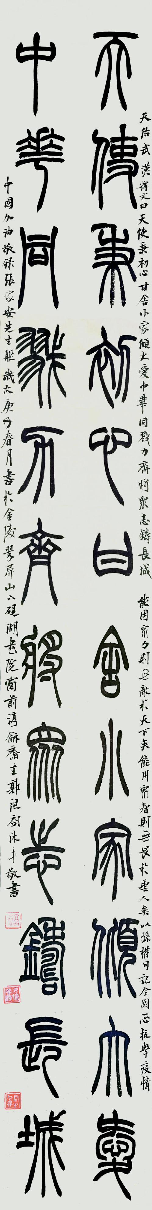 庚子鼠年,冠状病毒源起武汉,由荆楚蔓延全国甚至海外,寰宇惊恐。节日封城封区,市廛皆空,各居宅中。又闻各国火灾,流感,鼠疫,火山,海啸等不断,酷灾连绵,可谓浩劫。然国人意志坚定,戮力同心,捍御有力,局面稳定。文艺工作者以诗书画印为武器,表达情愫,支援江城。多难兴邦,一方有难,八方支援,事无巨细犹见赤誠。感念之,特此创作。