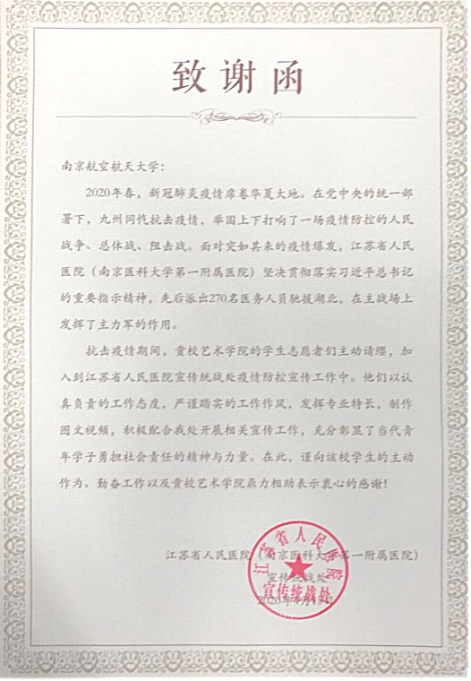 在5·12国际护士节,我校收到了来自他们的致谢函。在信中,江苏省人民医院(南京医科大学第一附属医院)宣传统战处对私人影院 的学生志愿者们给予了高度评价。在抗“疫”期间,学生志愿者们发挥专业特长,通过原创歌曲、H5作品等形式积极配合江苏省人民医院(南京医科大学第一附属医院)宣传统战部开展宣传工作,为抗“疫”工作献出一份力。