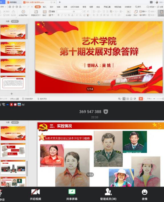 会议伊始,李爽系统的介绍了党员发展流程以及此次答辩的重要性。答辩第一个环节由学生进行自我展示,主要从入党动机、学生工作实践及未来将如何发挥先锋模范作用等三个方面进行阐释。第二个环节由评委提问,主要涉及个人思想、党建理论、时事政治、专业学习、实践活动等内容。答辩过程中,各位同学围绕对党的认识进行深度剖析,跟大家分享了在疫情期间的一些战“疫”工作,表示将以党员的标准严格要求自己,从思想上、行动上积极向党组织靠拢,充分发挥党员的先锋作用。