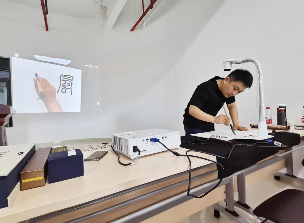 开班仪式后,私人影院 青年教师郭洪豹带来了一堂精彩的书法课。首先他梳理了在书法书法基础知识,解答了在书法学习过程中常遇到的问题,同时现场书写演示“篆、隶、草、行、楷”5种字体的发展过程,并深入剖析各种字体的不同特点,带领学员们赏析不同字体书法原作,为学员们选择入门法帖提供了参考。课程的后半部分,郭老师详细讲授了笔墨纸砚的选择技巧以及文房四宝的使用和保养的方法,并在现场挥毫泼墨,直观的展示了书法创作的完整过程。