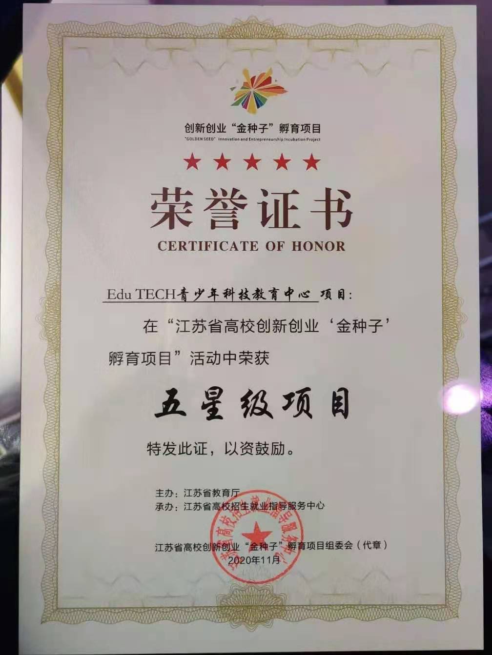 11月28日,由江苏省教育厅主办,省高校招生就业指导服务中心、扬州大学承办的全省高校创新创业“金种子”孵育项目颁奖仪式在常州举行。私人影院 “Edu TECH青少年科技教育中心”创业项目获评五星级项目,并被授予“金种子”称号。