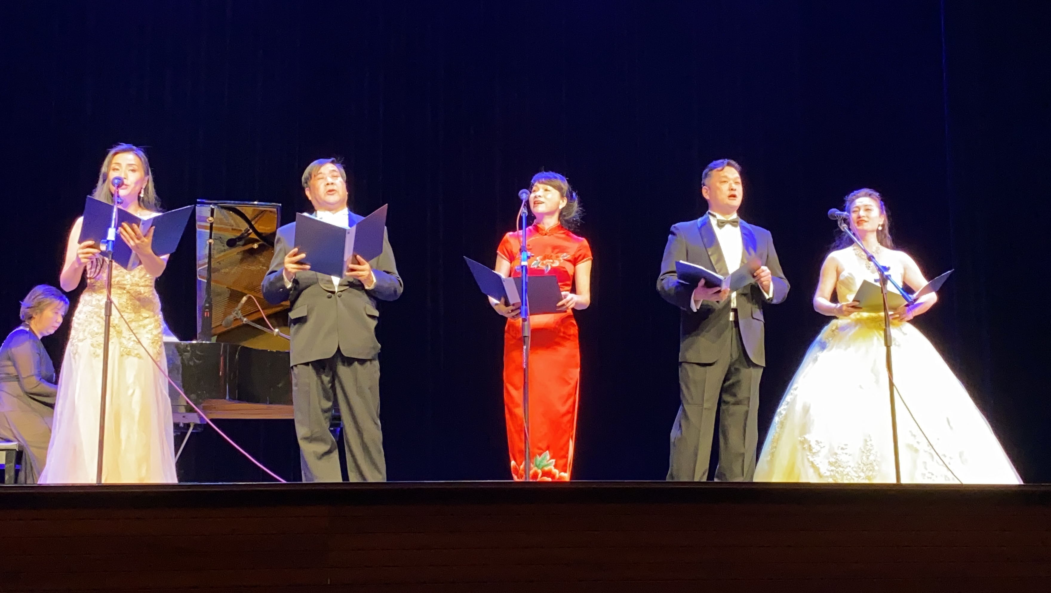 上半场最后一曲是由音乐系的五位声乐老师联袂合唱的一首《把一切献给党》,体现了音乐学院的全体老师们对党和国家由衷的敬意,将整个音乐会推向了高潮。