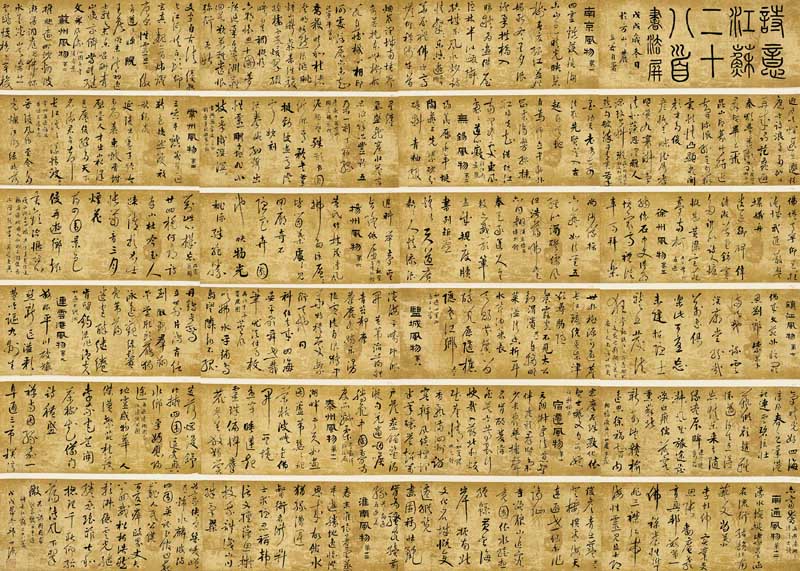 邱世鸿教授选择诗书并茂形式,最终创作长度2.25米高度2.00米的巨作,以24件仿古横幅联缀而成。颜色淳雅,行草风流。选择江苏十三座地级市的纪游诗为例,其中南京,苏州风物诗各三首,无锡、常州、徐州、扬州、镇江、盐城、连云港、南通、宿迁、淮安风物各二首。隶书题名,行草写诗,整体庄谐相济,蔚为壮观。
