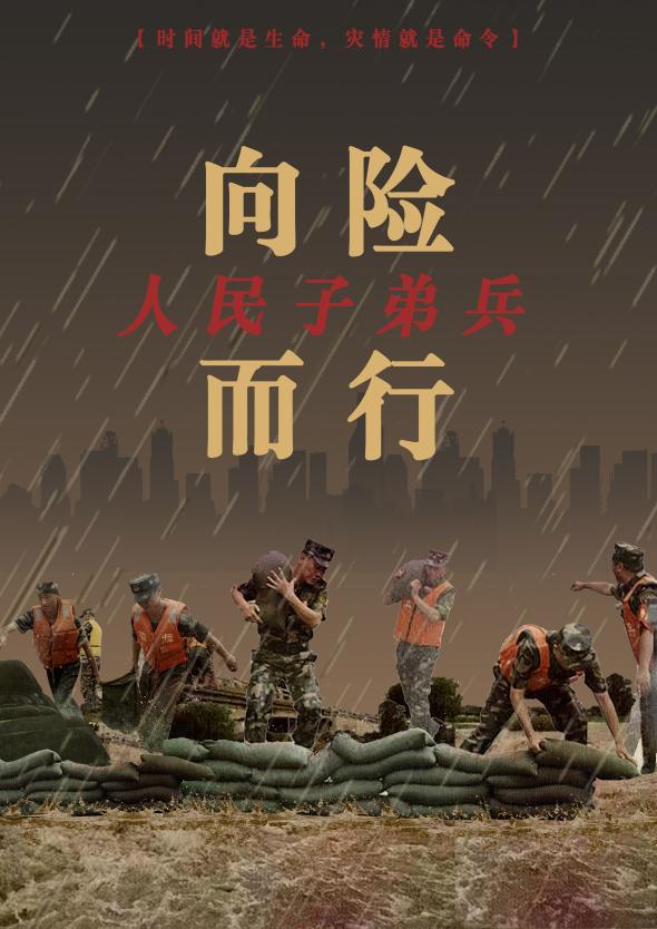 “千里长堤,军旗招展如今。他们乘坐皮筏艇在洪水中营救幸存者。”