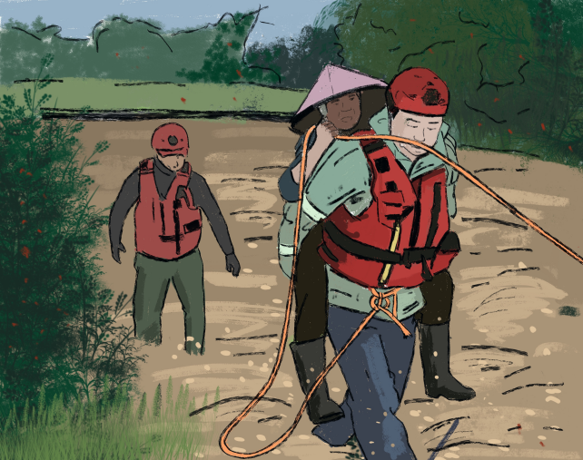救生衣的亮橙色是如此的刺眼,它给人们带来生的希望,彰显了洪水无情,人间有爱有真情的永恒主题。