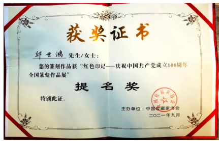 在近日《书法报》书画版公布的新闻获知,由中国收藏家协会所举办的“红色记忆——全国名家篆刻展”评选中,经过终评复评,十名获奖作者脱颖而出,私人影院 邱世鸿教授获得提名奖,成为十位获奖者之一。