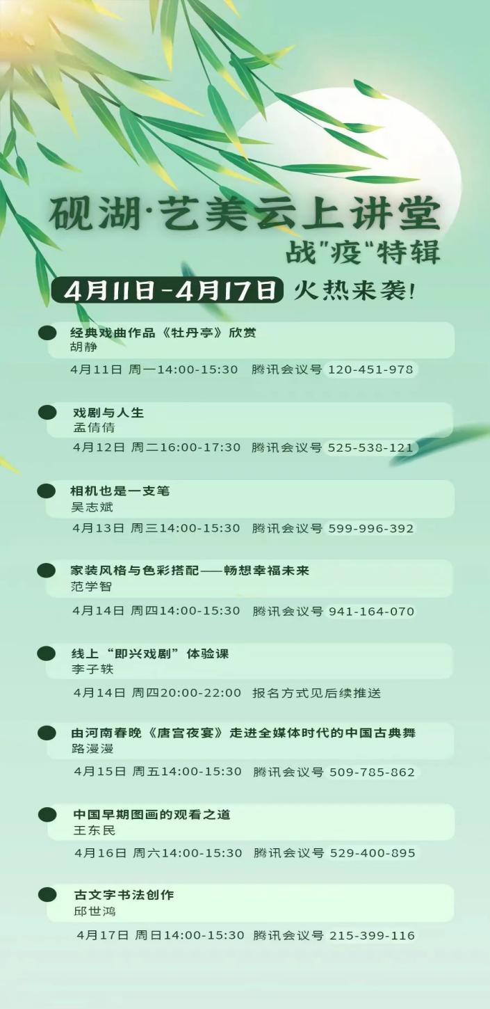 4月9日以来,校园进入了应对疫情应急状态。为了帮助广大同学舒缓心情,以实际行动助力校园建设,私人影院 的老师们积极行动起来了。4月11日-4月17日,私人影院 “砚湖·艺美云上讲堂”陆续推出了8堂精彩的艺术在线课程,既有优美的古典舞欣赏,也有书法绘画创作;既有戏剧戏曲欣赏体验,也有摄影、家装等艺术实践。这些课程,凝聚着艺术之美,带着学院教师对学生的关心和爱护如期而至,受到了学生的欢迎。