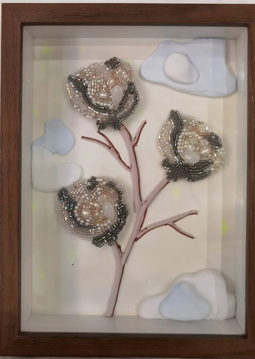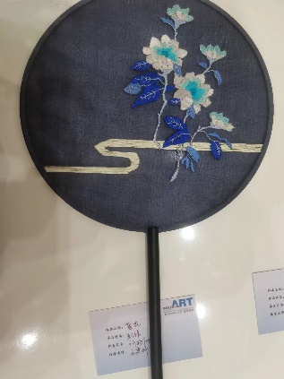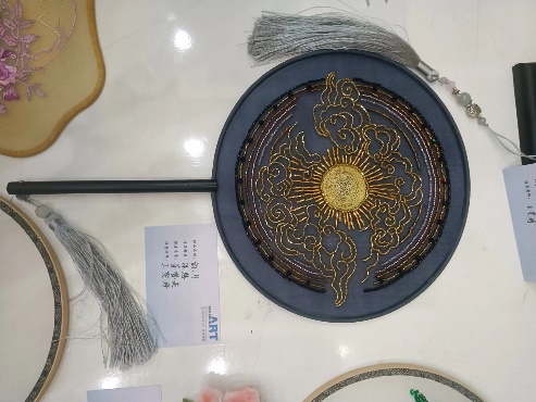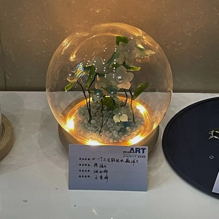 在展台上,我们可以看到来自21级学生们各式各样的手工作品,其中运用了包括刺绣、珠绣、缠花、绒花、香囊、热缩片、扭扭棒、造化液等各类“图案”手工制作方式,以最为直接的手工实践展现出了中华传统文化当中的图形美。