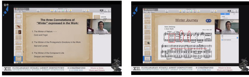 研讨会上,板俊荣主要介绍了“四季体”和“月令体”中国民歌中反映气候变化的相关内容,并结合分节歌《孟姜女十二月歌》中曲调随唱词内容的不同而变化,民间歌者也往往会随着月令之变在音色的驾驭上呈现出丰富的表现内涵。苏航在发言中详细介绍了舒伯特声乐套曲《冬之旅》中曲调、织体及其他音乐元素随气候变化而呈现的丰富样态,他还现场示范了较多段落的演唱与伴奏,结合视听同感转换阐释了作曲家的每个创作细节。两位老师的演讲深得与会专家的认同,组委会将会议视频在线下会场多次播放。