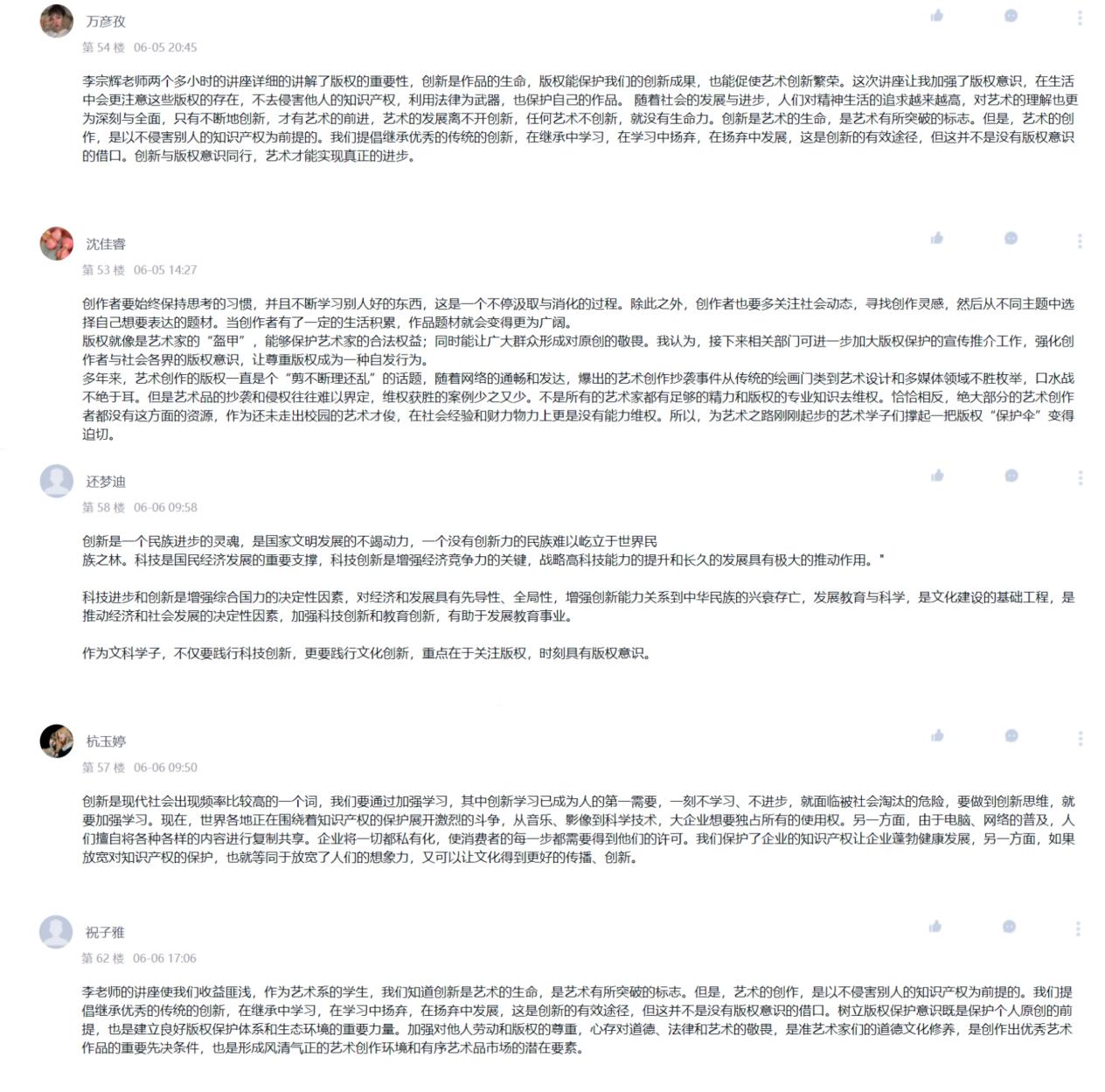 本次讲座拓展了同学们关于作品版权方面的知识,意义深远,在学习通的《艺起学习》模块,同学们纷纷上传了个人学习心得,对于艺术作品的版权问题有了更加深度的思考与个人见解,创新与版权意识同行,艺术才能实现真正的进步。