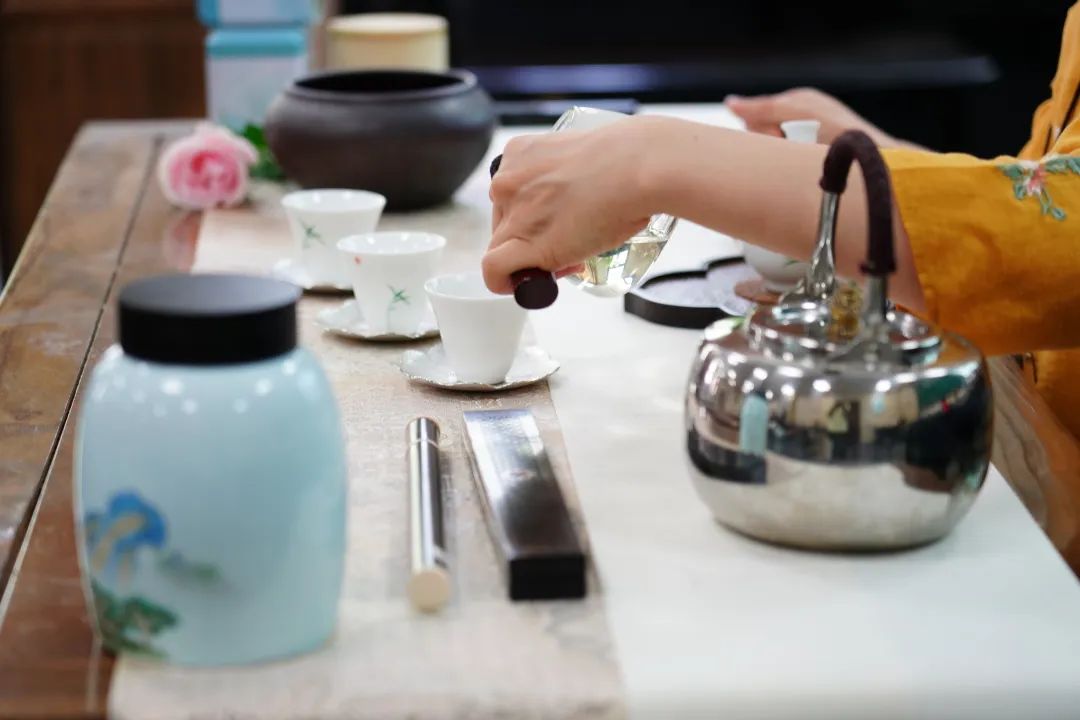 在初步学习了茶文化的相关知识后,老师们跃跃欲试,纷纷加入到茶艺实践操作中来。淋霖瓯杯、点水流香……静待两分钟,茶叶香韵四溢。