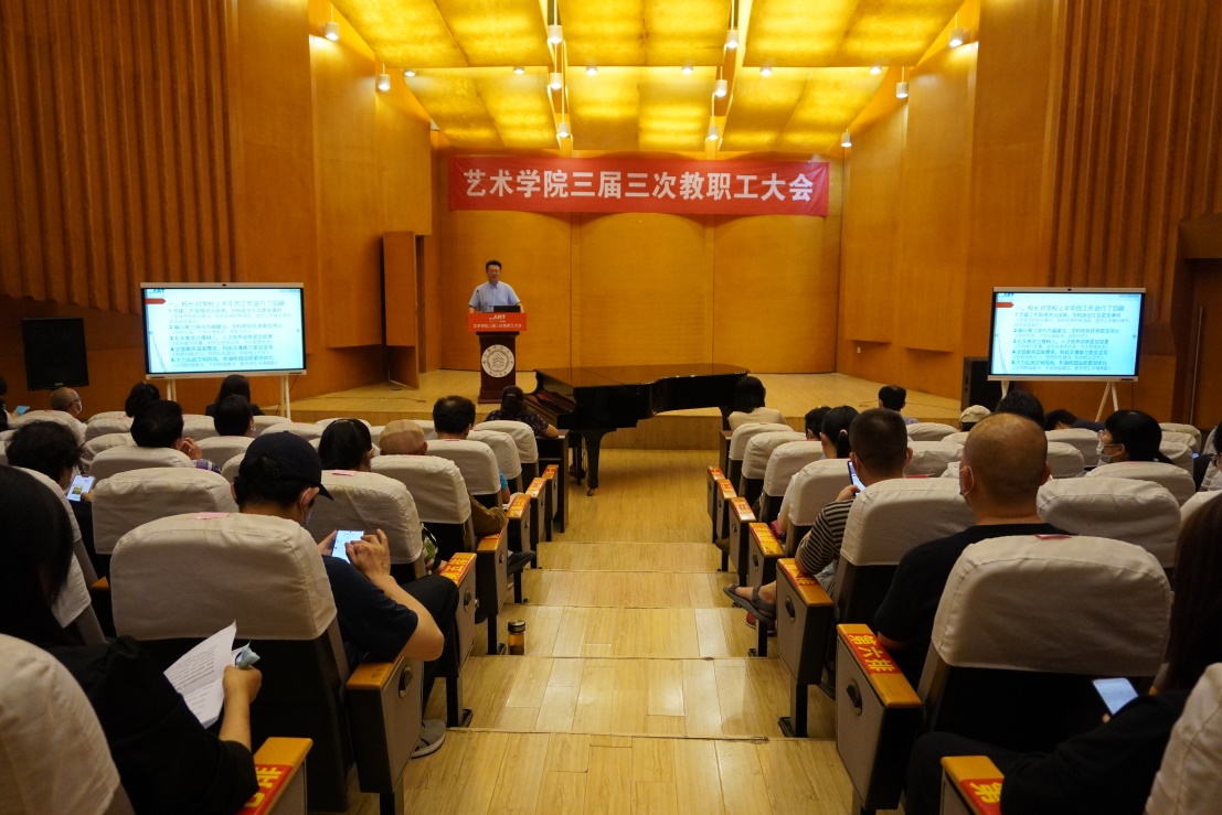 院长板俊荣对照学校、学院“十四五”发展规划目标和年度指标任务,向全院教职工传达了校党委副书记、校长单忠德所做工作报告、校党委书记郑永安总结讲话的主要精神。对学院当前面临的形式作了具体分析,并从党建引领、学科建设、师资引聘、国际交流、疫情防控、安全稳定等15个方面,全面规划了学院下半年的主要工作要点。他指出,全院教职工要毫不放松抓好疫情防控,坚决维护校园安全,牢牢把握立德树人根本任务,秉持认真负责、恪尽职守的态度,积极投入到新学期教育教学工作中。特别是加快推进国家级、省级特色专业内涵建设,完成学科整合,做好新学期学科申报的准备工作。他提出,在配合学校做好校庆70周年的同时,遵循学校节俭办校庆的工作思路,坚持党建引领,围绕学院专业和学科建设,加强学院制度建设。全力打造“艺工融合 双向驱动”的发展路径,为校庆70周年、学院20周年等系列工作夯实基础。