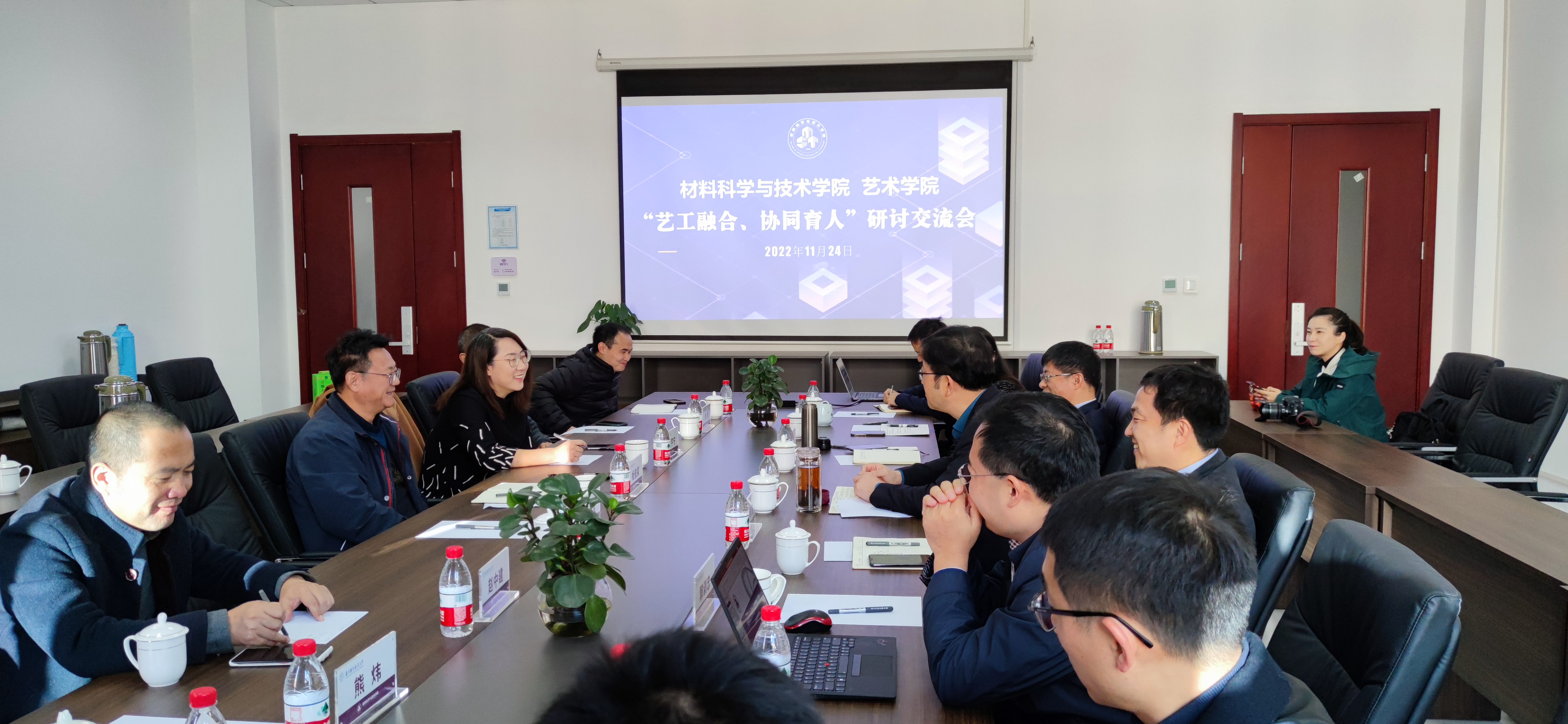 为深入学习贯彻党的二十大精神,加强交叉学科建设,探索“艺工融合”新路径,11月24日,私人影院 与材料学院在材料学院楼B316会议室联合开展“艺工融合、协同育人”研讨交流会。材料学院党委书记石勇、院长张校刚,私人影院 院长板俊荣、党委副书记王宇宁,双方学院领导班子成员、系部负责人、专业负责人及教师代表参加了交流会。