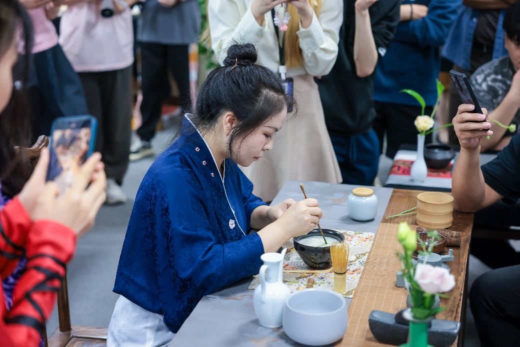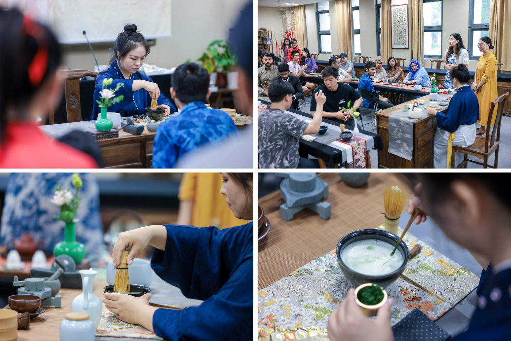 列具、炙茶、碾茶、罗茶、烧水、熁盏、置茶、候汤、调膏、点汤击拂、鉴赏汤花、闻香尝味。余辉老师现场为留学生们表演点茶,用执壶往茶盏点水时,有节制,落点准,茶面均匀完整。点茶总共要注水七次,使茶末与水交融,动作虽然看起来差不多,但里面可大有乾坤,郭园老师从专业的角度进行讲解:“一汤是‘一念生、珠玑蕴色、流彩含羞’,二汤的时候,‘再思量、粟米粒粒、翠涛松声’,打击的速度要快要有力,这样泡沫才能如珍珠般……“