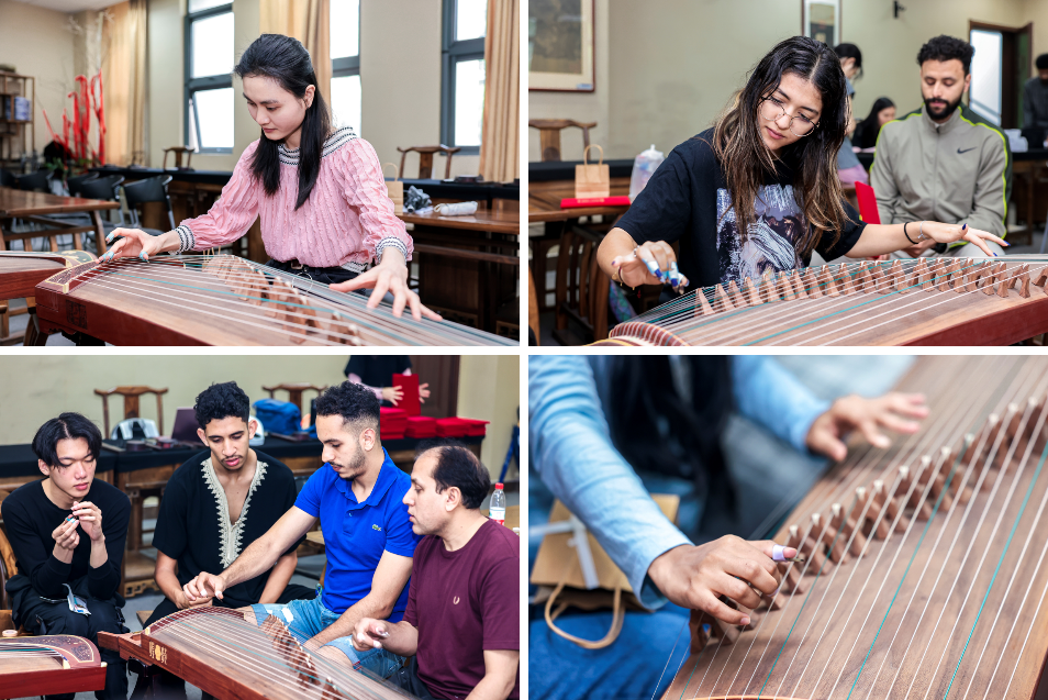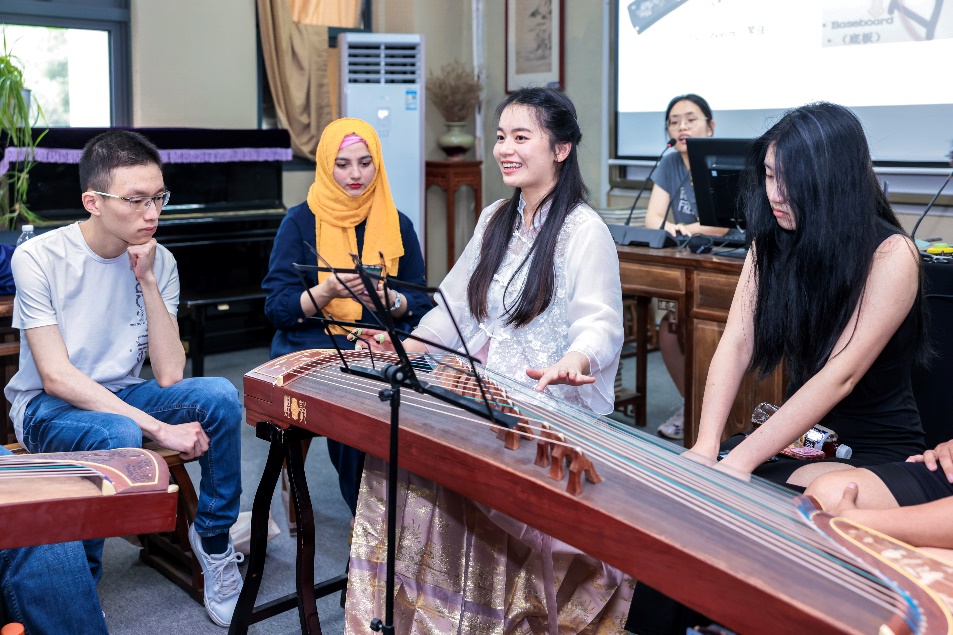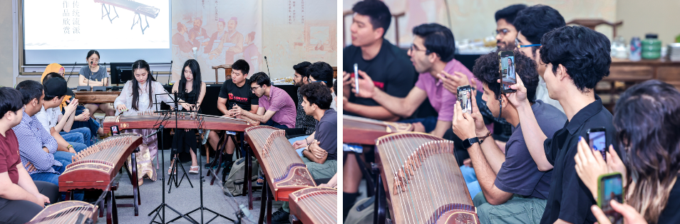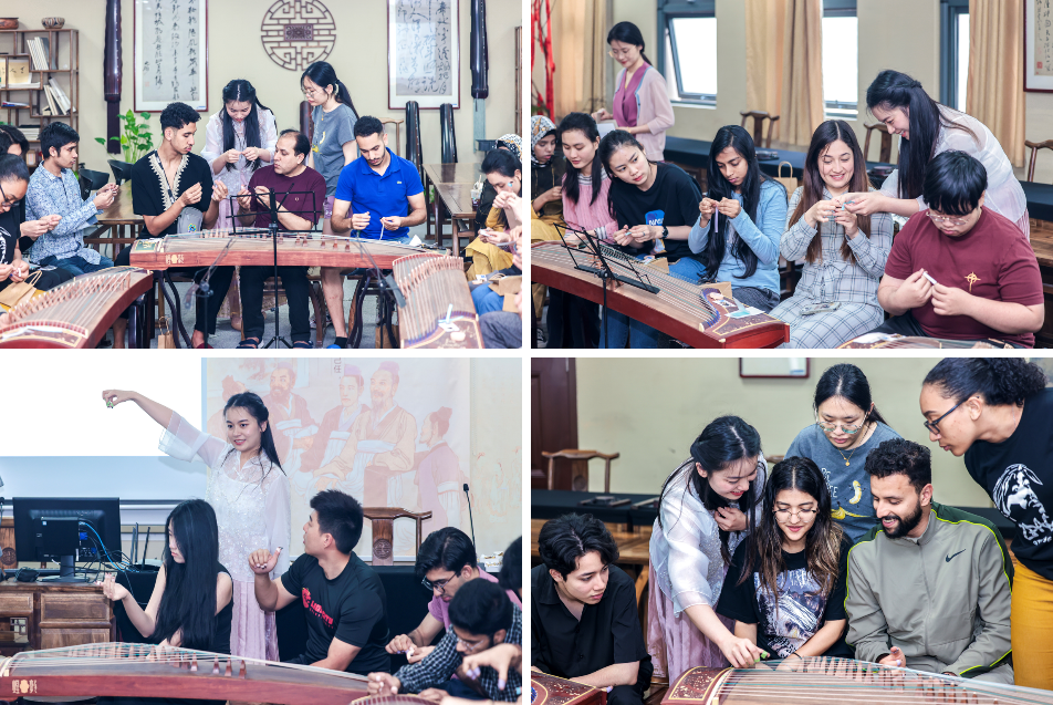 现场,老师为每位学员准备一份古筝义甲,指导并帮助留学生们正确佩戴,通过现场解析与演奏示范,由浅入深,循序渐进地教留学生们,如何运用相应的演奏技巧去展现古筝曲的风格与韵味。