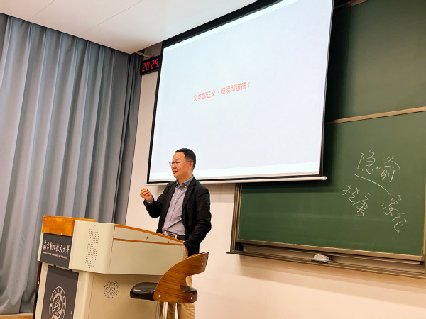 2023年秋季学期,私人影院 以新时代美育概论课程为平台,开展了高水平校外专家进课堂系列活动。新时代美育概论课程是由私人影院 院长板俊荣教授领衔、汇聚学院不同学科背景的优秀师资所开设的面向全校公选的荣誉课程。自2021年首开以来,一直尝试不断创新。2023年秋,课程尝试引进校外高水平师资,走进课堂向学生分享最新的美育理念与实践。2023年11月21日,应新闻系主任蔡雁彬邀请,江苏第二师范学院文学院刘学军副教授来到了私人影院 的美育课堂,走进天目湖校区T115教室开展教学讲座。