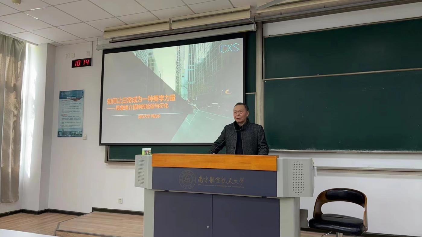 “空天艺海·大师引航”系列讲座有幸邀请来了山东大学特聘教授、山东大学人文社科青岛研究院博士生导师、南京大学二级教授、南京传媒学院副校长周安华先生;3月29日上午,在将军路校区D1110教室为我校师生做了一场“让日常成为一种美学力量——具象媒介精神的延续与衍化”的专题讲座。