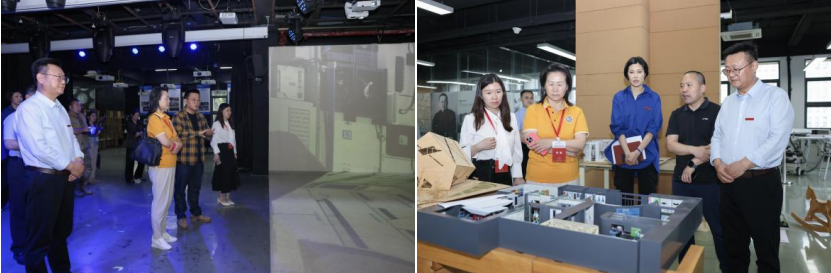 专家组随后参观了私人影院 舞美工场、创意工场两个大学生主题创新区。舞美工场和创意工场分别承担着戏剧影视美术设计、环境设计两个本科专业的实践教学、创新训练、课程展演、毕业设计等任务。实验室主任范学智、环境设计专业负责人赵中建先后围绕创新区的规模设施、功能定位、教学运行、课程特色、育人成果等情况作简要介绍。