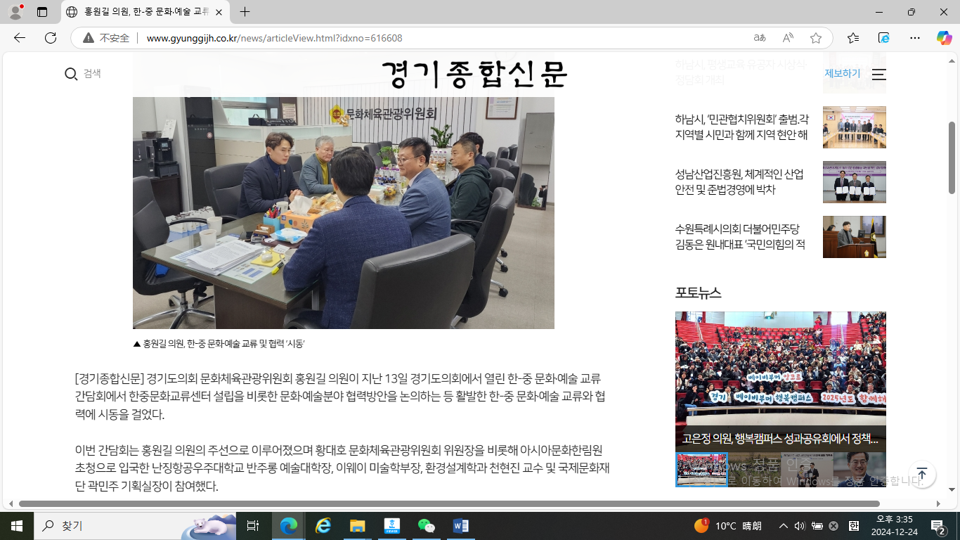12月13日,代表团与韩国京畿道议会文化体育观光委员会举行了座谈会。此次座谈会由京畿道议会议员洪元吉组织,京畿道议会文化体育观光委员会委员长黄大浩议员亦出席并发表了充满热情的演讲。黄大浩议员对南航私人影院 代表团的到来表示了诚挚的欢迎,并特别强调了中韩交流在京畿道知事金东渊(省级行政区首长)的政策规划中所占据的核心地位。他指出,目前京畿道正将中韩交流作为工作重点,并致力于在经贸、科技、教育、环境、健康、农业、观光等多个领域深化两国合作。黄大浩议员还明确表态,将与京畿道及其议会国际交流相关部门携手,积极探讨合作事宜,为双方合作项目提供全面的支持与保障,共同促进中韩文化交流合作的实质性发展。