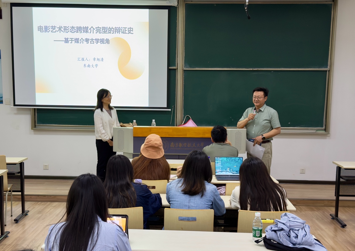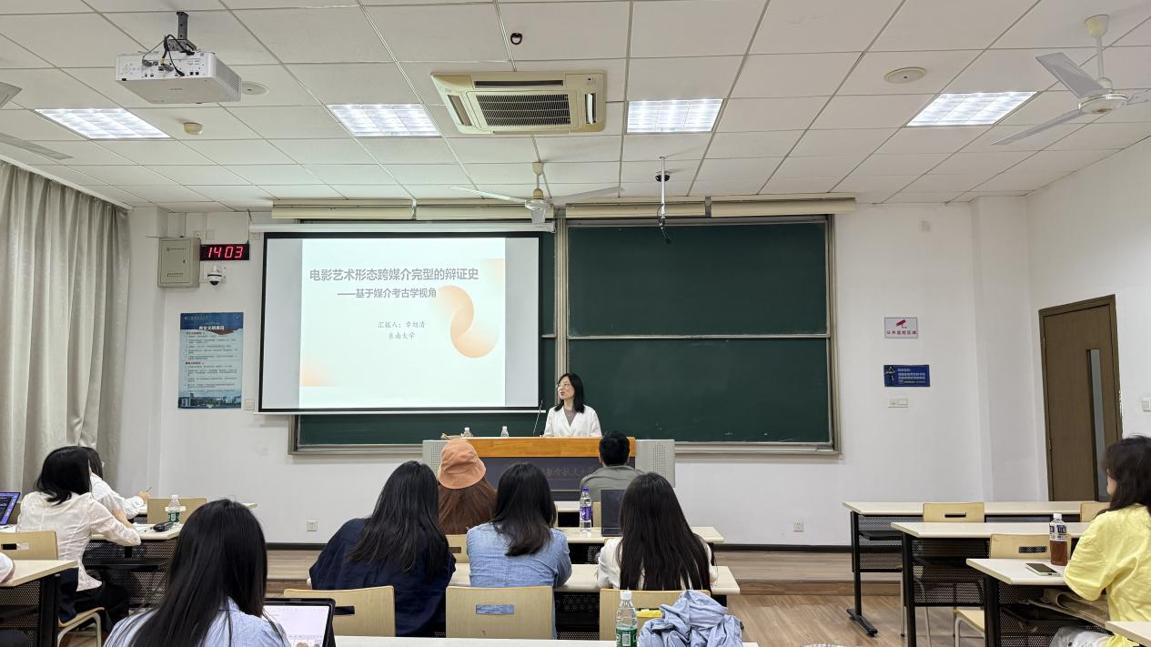 五月的江宁阳光明媚,微风和煦。29日下午,东南大学私人影院 博士生导师章旭清教授应我校私人影院 邀请,为师生带来一场“电影艺术形态跨媒介完型的辩证史——基于媒介考古学视角”的专题讲座。板俊荣教授主持了本次讲座,广播电视艺术学学科负责人罗良清教授担任对话专家,现场学术氛围浓厚,新闻传播系讲师马健、高娜及将军路校区四十余位同学共同出席本次活动。