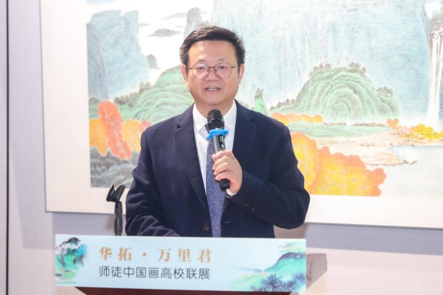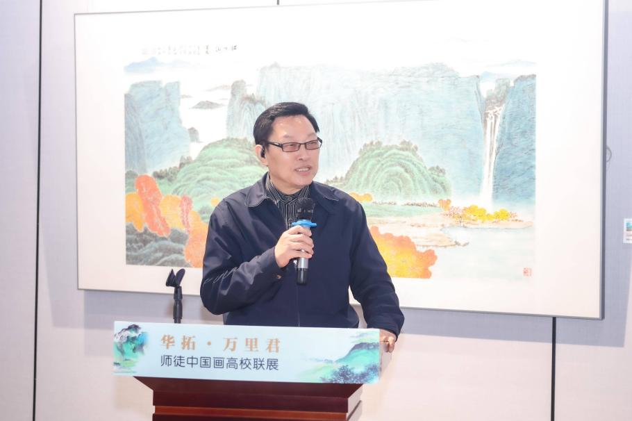 高云称赞展览是“高雅艺术进校园”的一次有益实践。他提到江苏美术底蕴深厚,青绿山水创作难度极高,而华拓作为杰出的青绿山水画大家,其技艺被万里君一脉相承,师徒二人的作品充分展现了中国画的艺术高度。他进一步阐释画山水有眼中山水、胸中山水、理想中山水三重意境,认为华拓的山水画作达到了“理想中的山水”这一最高境界,蕴含着对艺术的深刻追求。
