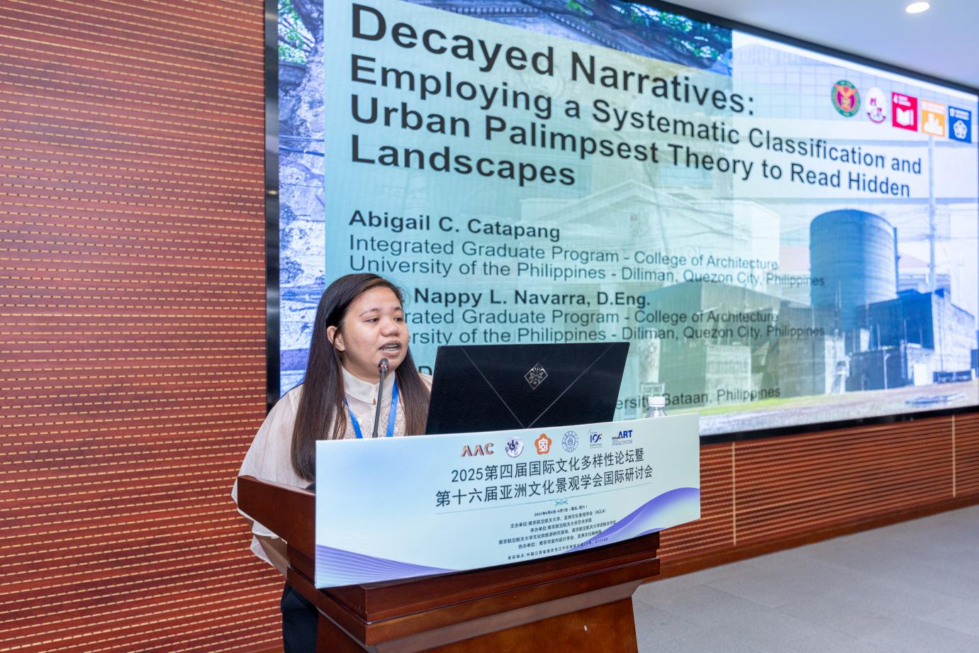 在下午的第二场会议中,亚洲文化景观学会副主席Ray March Syahadat先生从传统服饰与文化认同角度发表演讲;私人影院 讲师赵罗曼博士分享了其在食物景观与包容性食物规划方面的研究成果,为本次国际会议增添了地方实践的独特视角;加图立大学讲师Jeon Hyun Jeong博士从“音乐对文化景观的影响”切入,呈现了跨媒介的文化景观构建路径;菲律宾大学博士生Abigail Cruz-Catapang则以系统与叙事为方法,解读了菲律宾城市中的“隐藏景观”。