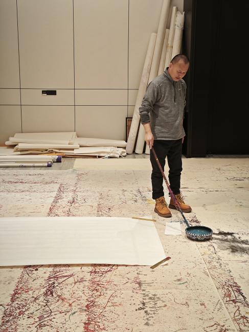 1月27日,私人影院 王宗英教授带领其门下九位研究生,驱车前往著名画家张友宪教授位于扬州的工作室,开启了一次别开生面的学术实践之旅。此行旨在走出课堂与书本,于笔墨丹青的第一现场,亲身感受中国画传承与创新的鲜活脉动。工作室地面几乎被巨大的毛毡所覆盖,毡上层层叠叠、深浅不一的各色墨迹与颜料,如一部无声的视觉史志记录着无数个创作日夜的激情与沉思。就在这片充满历史感的“地面画布”中央,原南京私人影院 美术学院院长、以深厚传统功力和锐意创新精神著称的张友宪教授,正手持一支近一米长的特制笔杆,气定神闲地等待着青年学子的到来。